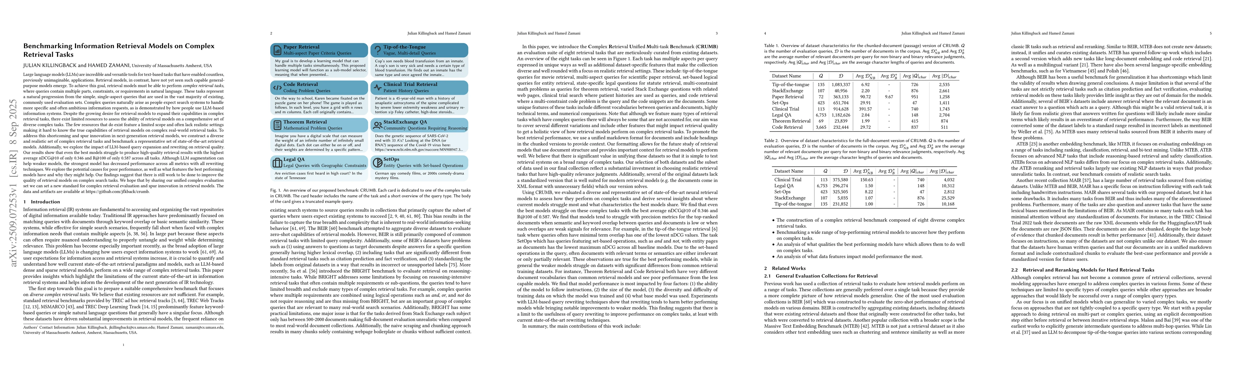 Large language models (LLMs) are incredible and versatile tools for text-based tasks that have enabled countless, previously unimaginable, applications. Retrieval models, in contrast, have not yet seen such capable general-purpose models emerge. To achieve this goal, retrieval models must be able to perform complex retrieval tasks, where queries contain multiple parts, constraints, or requirements in natural language. These tasks represent a natural progression from the simple, single-aspect queries that are used in the vast majority of existing, commonly used evaluation sets. Complex queries naturally arise as people expect search systems to handle more specific and often ambitious information requests, as is demonstrated by how people use LLM-based information systems. Despite the growing desire for retrieval models to expand their capabilities in complex retrieval tasks, there exist limited resources to assess the ability of retrieval models on a comprehensive set of diverse complex tasks. The few resources that do exist feature a limited scope and often lack realistic settings making it hard to know the true capabilities of retrieval models on complex real-world retrieval tasks. To address this shortcoming and spur innovation in next-generation retrieval models, we construct a diverse and realistic set of complex retrieval tasks and benchmark a representative set of state-of-the-art retrieval models. Additionally, we explore the impact of LLM-based query expansion and rewriting on retrieval quality. Our results show that even the best models struggle to produce high-quality retrieval results with the highest average nDCG@10 of only 0.346 and R@100 of only 0.587 across all tasks. Although LLM augmentation can help weaker models, the strongest model has decreased performance across all metrics with all rewriting techniques.