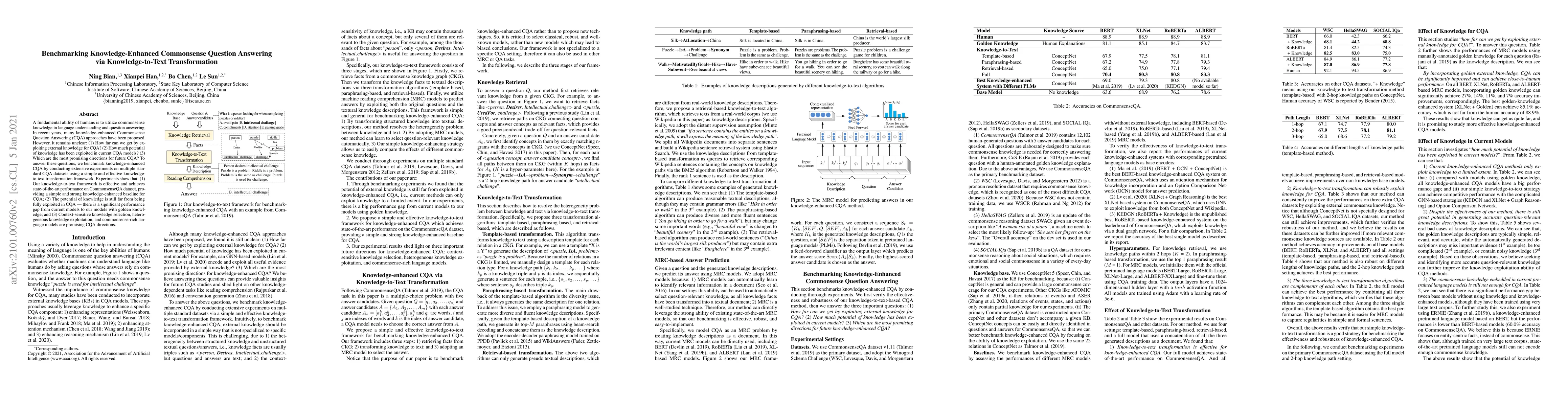 This paper benchmarks knowledge-enhanced Commonsense Question Answering (CQA) using a knowledge-to-text transformation framework, achieving state-of-the-art results on the CommonsenseQA dataset. It highlights the underutilization of knowledge in current CQA models and suggests future directions including context-sensitive knowledge selection and commonsense-rich language models.