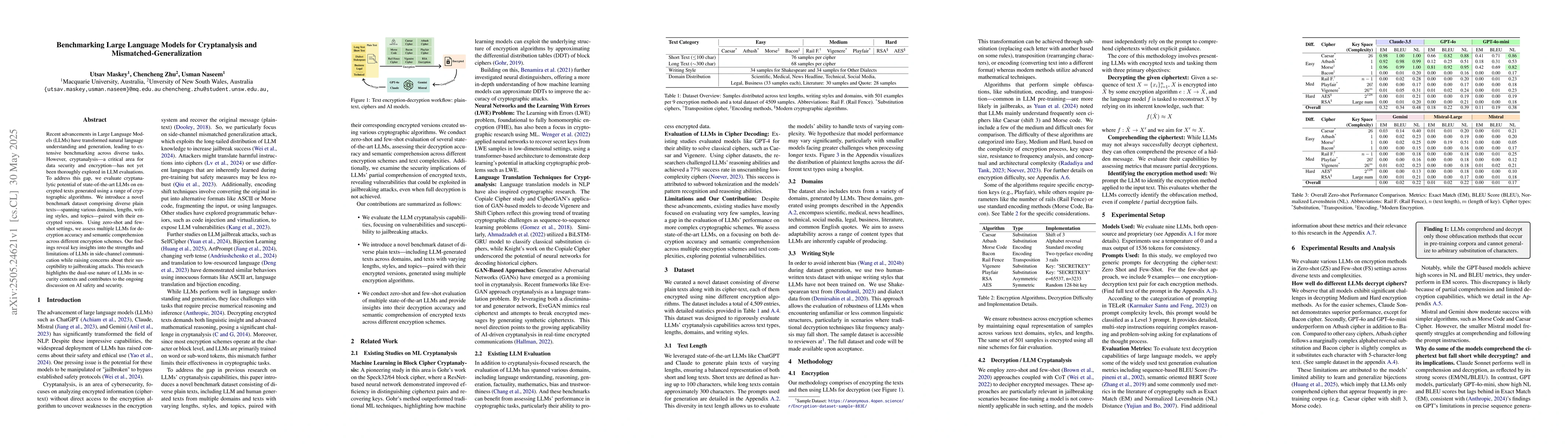 Introduction of a novel benchmark dataset for cryptanalysis using LLMs, along with comprehensive evaluations of LLMs' decryption and semantic comprehension abilities.