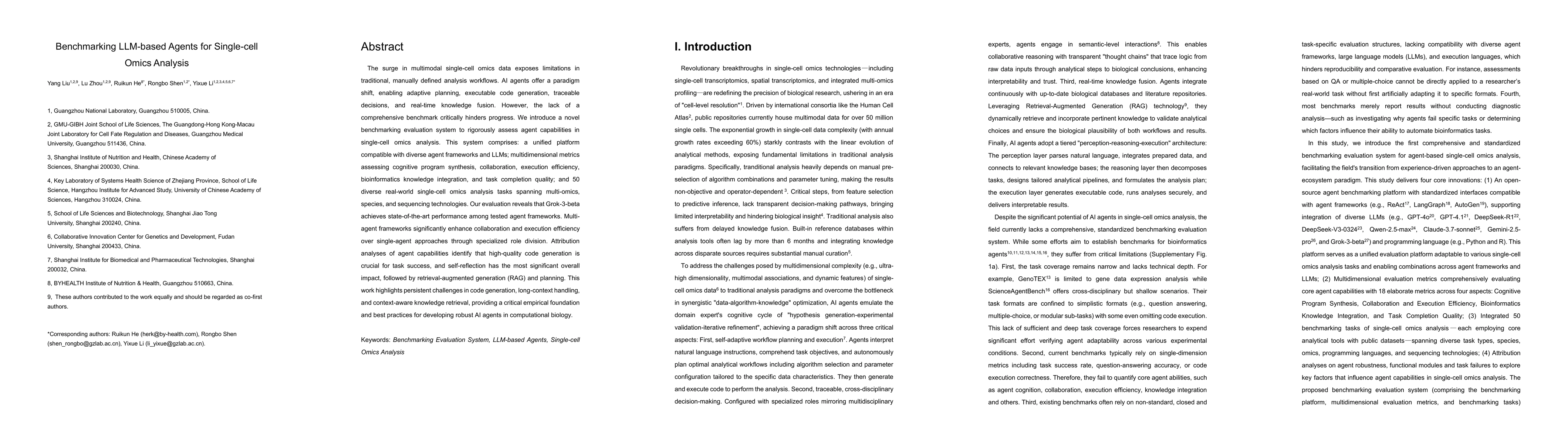 The surge in multimodal single-cell omics data exposes limitations in traditional, manually defined analysis workflows. AI agents offer a paradigm shift, enabling adaptive planning, executable code generation, traceable decisions, and real-time knowledge fusion. However, the lack of a comprehensive benchmark critically hinders progress. We introduce a novel benchmarking evaluation system to rigorously assess agent capabilities in single-cell omics analysis. This system comprises: a unified platform compatible with diverse agent frameworks and LLMs; multidimensional metrics assessing cognitive program synthesis, collaboration, execution efficiency, bioinformatics knowledge integration, and task completion quality; and 50 diverse real-world single-cell omics analysis tasks spanning multi-omics, species, and sequencing technologies. Our evaluation reveals that Grok-3-beta achieves state-of-the-art performance among tested agent frameworks. Multi-agent frameworks significantly enhance collaboration and execution efficiency over single-agent approaches through specialized role division. Attribution analyses of agent capabilities identify that high-quality code generation is crucial for task success, and self-reflection has the most significant overall impact, followed by retrieval-augmented generation (RAG) and planning. This work highlights persistent challenges in code generation, long-context handling, and context-aware knowledge retrieval, providing a critical empirical foundation and best practices for developing robust AI agents in computational biology.