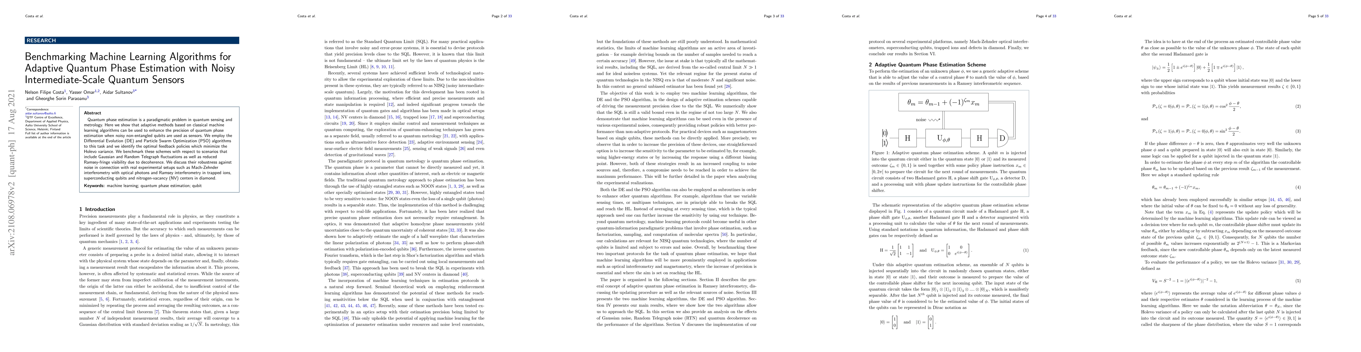 This paper benchmarks classical machine learning algorithms, specifically Differential Evolution and Particle Swarm Optimization, to enhance the precision of quantum phase estimation in noisy intermediate-scale quantum sensors. The study identifies optimal feedback policies minimizing Holevo variance and assesses robustness against various noise types in experimental setups like Mach-Zehnder and Ramsey interferometry.