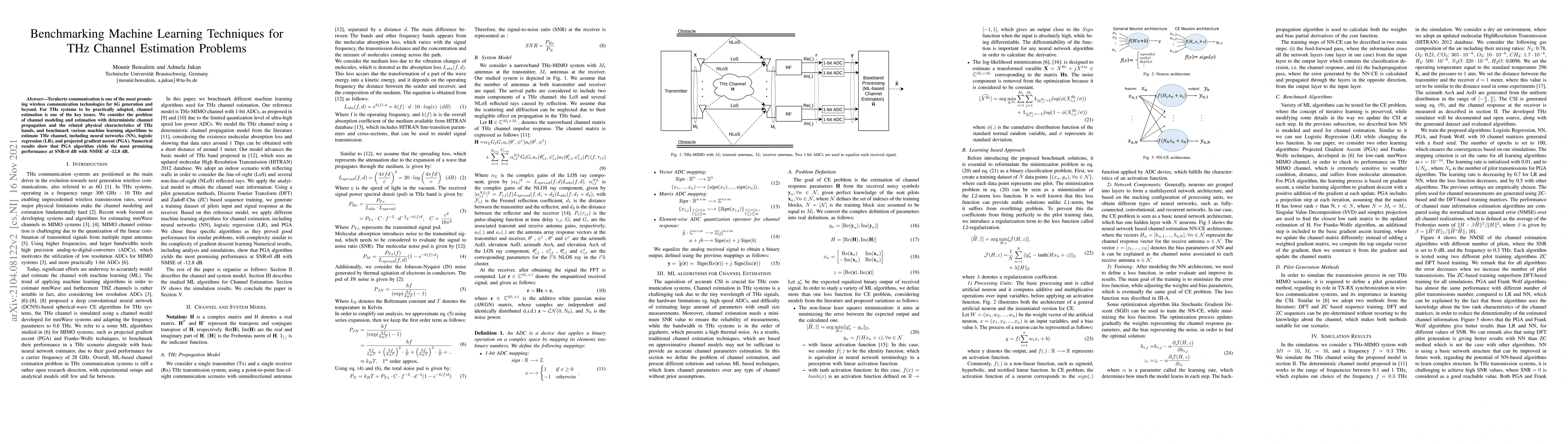 A study benchmarks machine learning algorithms for estimating THz channels in 6G communication systems, finding that projected gradient ascent yields the most promising performance at low signal-to-noise ratios.
