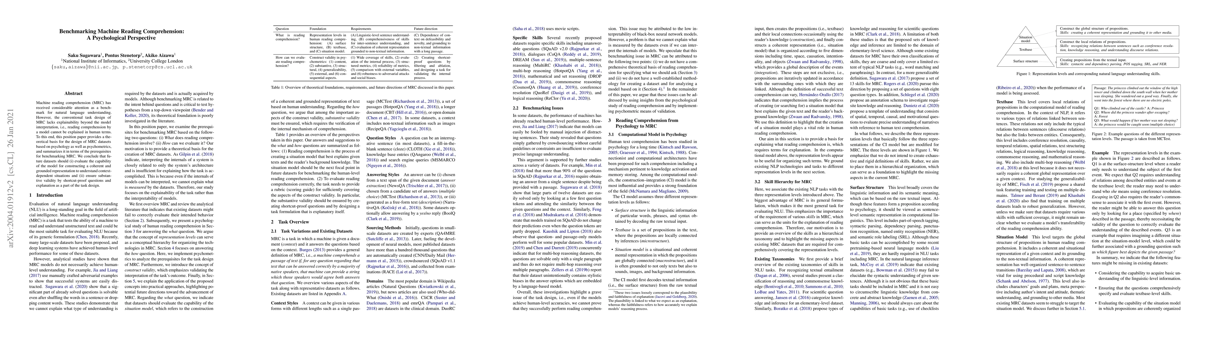 This paper argues for a psychological approach to designing machine reading comprehension (MRC) datasets, emphasizing the need for human-interpretable model performance. It proposes that future MRC benchmarks should evaluate models' ability to create coherent context-dependent representations and include substantively valid, shortcut-proof questions with explanations.