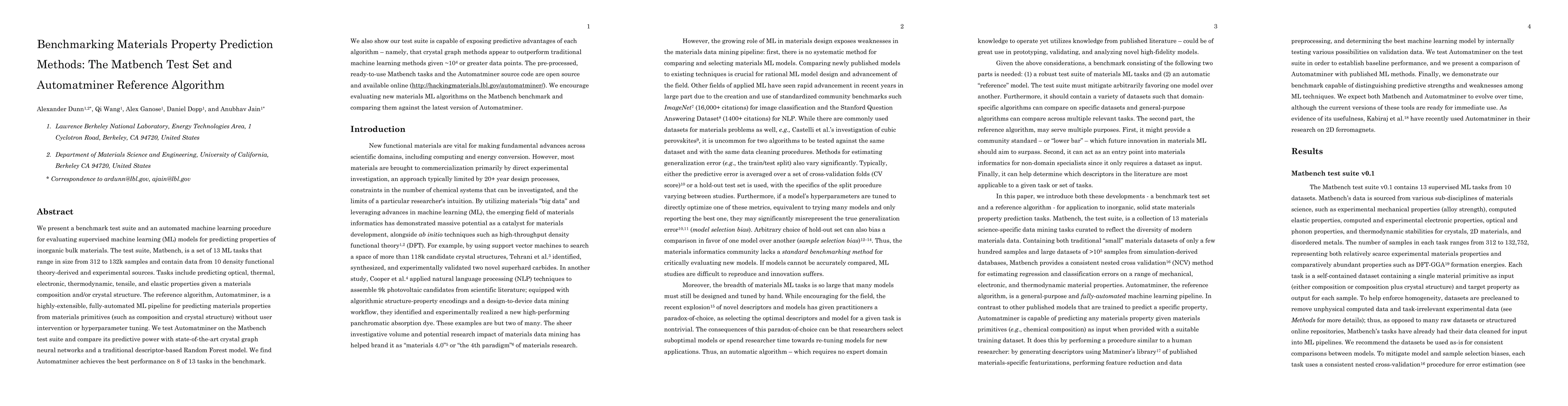 This paper introduces Matbench, a benchmark test suite for evaluating supervised machine learning models in predicting properties of inorganic materials, and presents Automatminer, an automated machine learning algorithm that outperforms others on 8 of 13 tasks. The study highlights the predictive advantages of crystal graph methods over traditional methods when sufficient data is available.