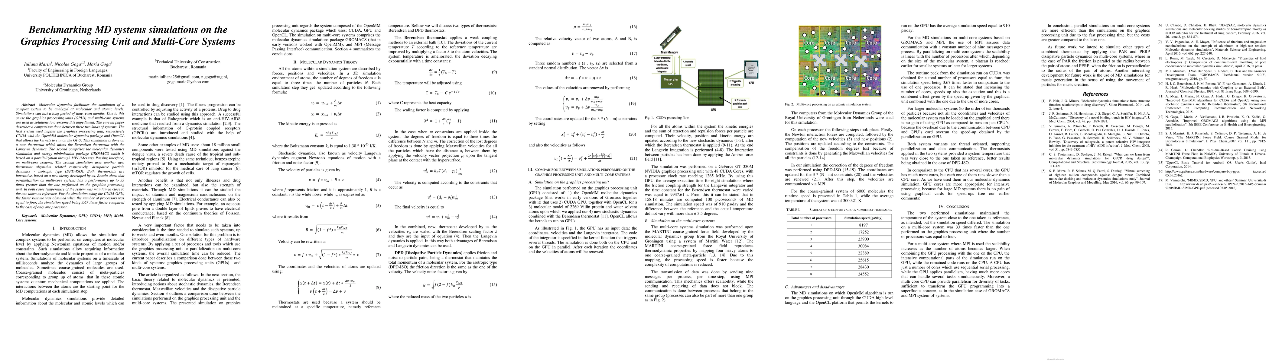 This paper compares molecular dynamics simulations on GPUs using CUDA with OpenMM and on multi-core systems using GROMACS with MPI. Results indicate that parallelization on multi-core systems achieves up to 33 times better performance compared to GPU simulations, though the latter showed a 3.67-fold speedup with four processors. Both systems maintained system temperature effectively.
