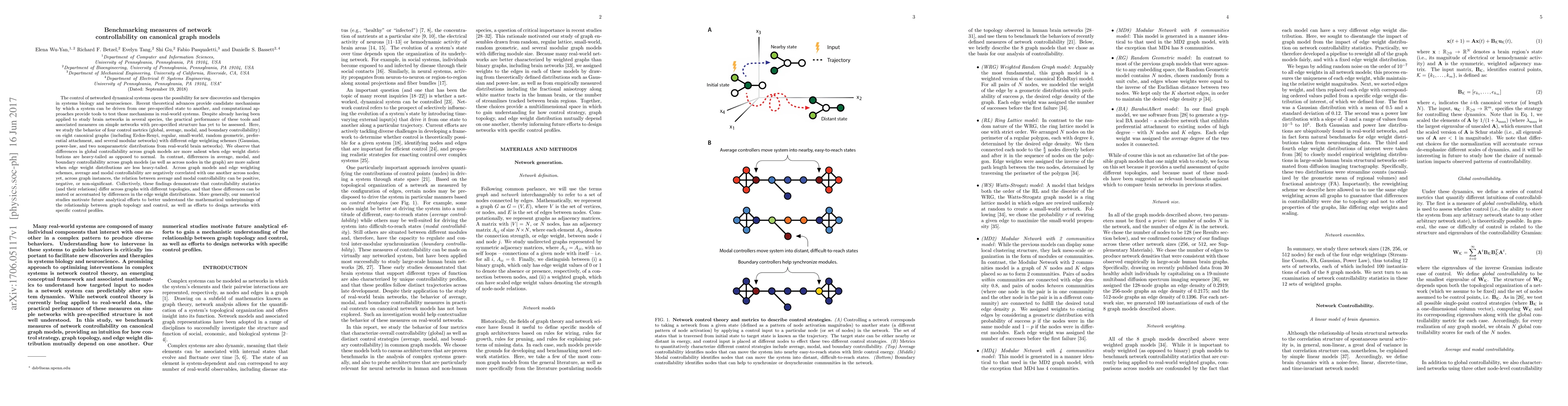 Many real-world systems are composed of many individual components that interact with one another in a complex pattern to produce diverse behaviors. Understanding how to intervene in these systems to guide behaviors is critically important to facilitate new discoveries and therapies in systems biology and neuroscience. A promising approach to optimizing interventions in complex systems is network control theory, an emerging conceptual framework and associated mathematics to understand how targeted input to nodes in a network system can predictably alter system dynamics. While network control theory is currently being applied to real-world data, the practical performance of these measures on simple networks with pre-specified structure is not well understood. In this study, we benchmark measures of network controllability on canonical graph models, providing an intuition for how control strategy, graph topology, and edge weight distribution mutually depend on one another. Our numerical studies motivate future analytical efforts to gain a mechanistic understanding of the relationship between graph topology and control, as well as efforts to design networks with specific control profiles.
