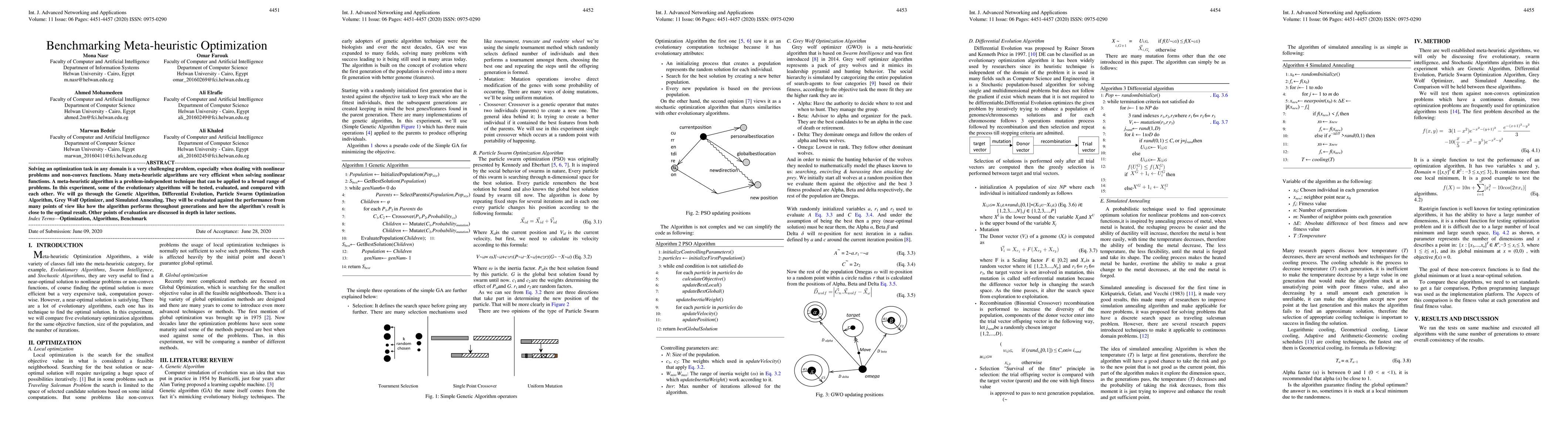 This paper benchmarks various meta-heuristic optimization algorithms, including Genetic Algorithm, Differential Evolution, Particle Swarm Optimization, Grey Wolf Optimizer, and Simulated Annealing, to evaluate their efficiency in solving nonlinear and non-convex optimization problems. The algorithms are compared based on their performance over generations and their proximity to optimal results.