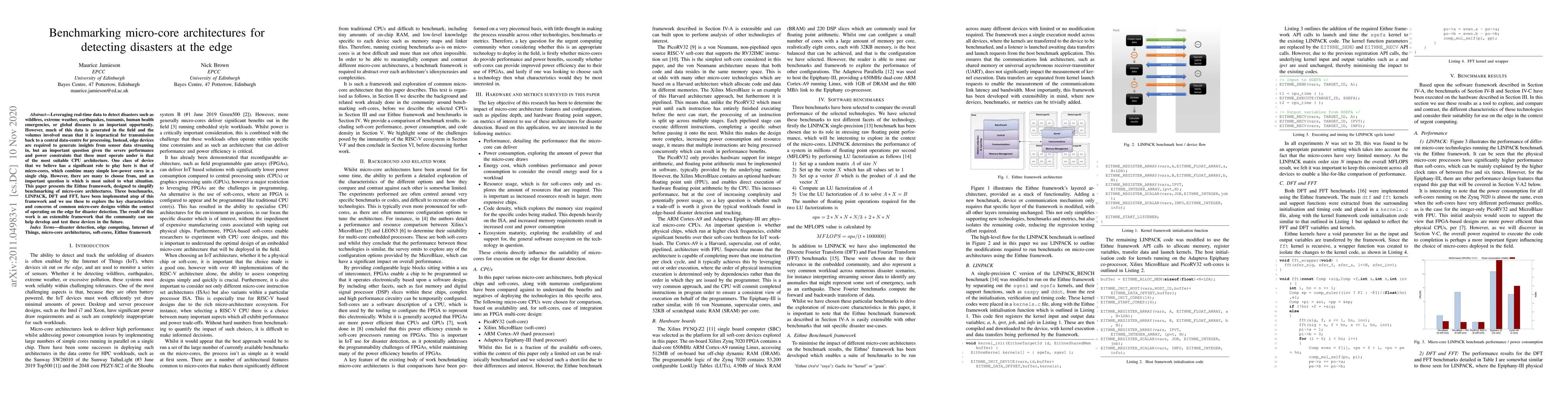 This paper introduces the Eithne framework to benchmark micro-core architectures for disaster detection at the edge, highlighting their performance and power characteristics.