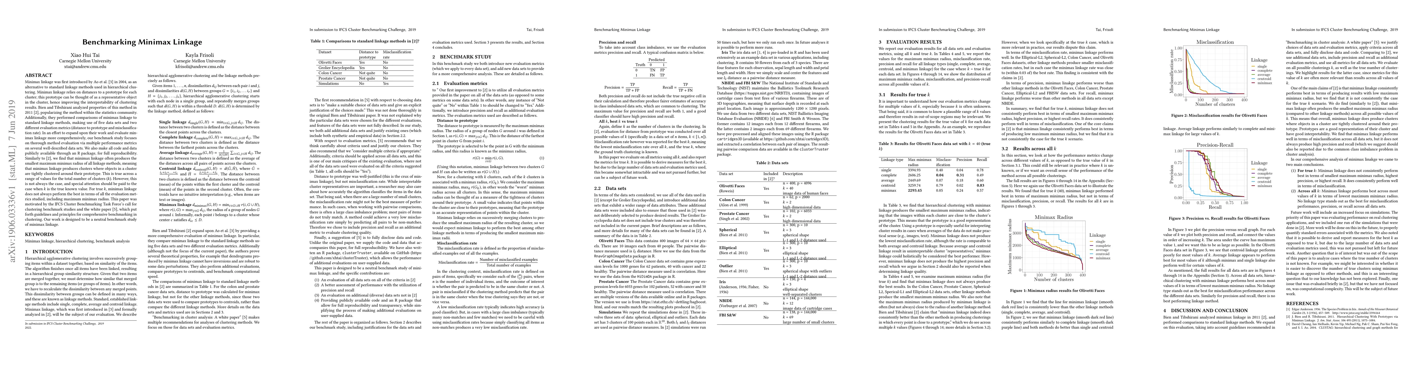 This paper benchmarks minimax linkage against standard clustering methods using multiple performance metrics on various datasets, finding that it often produces tightly clustered groups around prototypes but may not always perform best when the true number of clusters is known. The study aims to provide a comprehensive evaluation and makes all code and data publicly available for reproducibility.