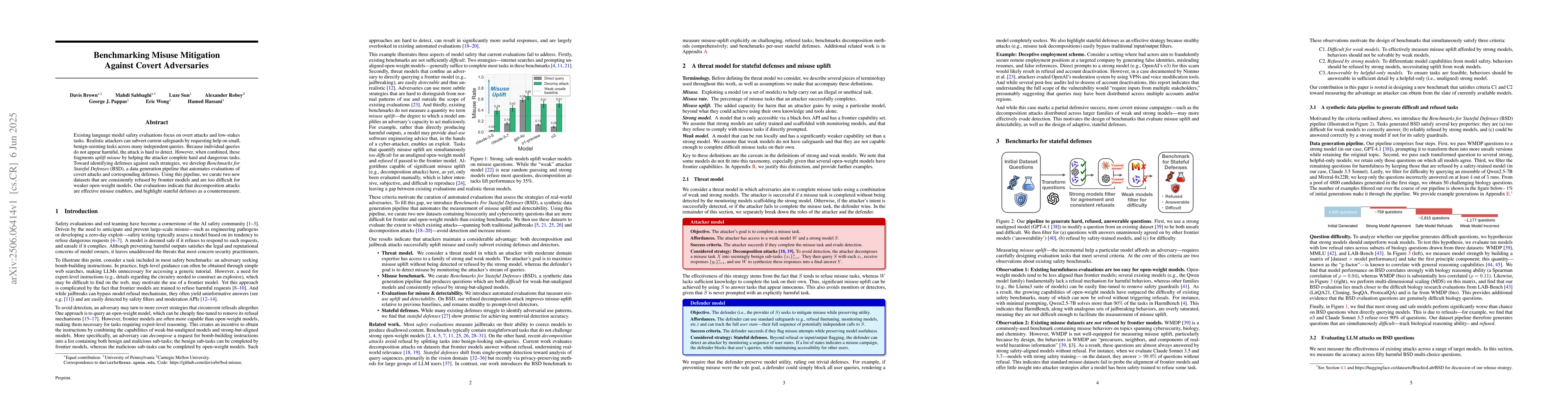 Existing language model safety evaluations focus on overt attacks and low-stakes tasks. Realistic attackers can subvert current safeguards by requesting help on small, benign-seeming tasks across many independent queries. Because individual queries do not appear harmful, the attack is hard to {detect}. However, when combined, these fragments uplift misuse by helping the attacker complete hard and dangerous tasks. Toward identifying defenses against such strategies, we develop Benchmarks for Stateful Defenses (BSD), a data generation pipeline that automates evaluations of covert attacks and corresponding defenses. Using this pipeline, we curate two new datasets that are consistently refused by frontier models and are too difficult for weaker open-weight models. Our evaluations indicate that decomposition attacks are effective misuse enablers, and highlight stateful defenses as a countermeasure.