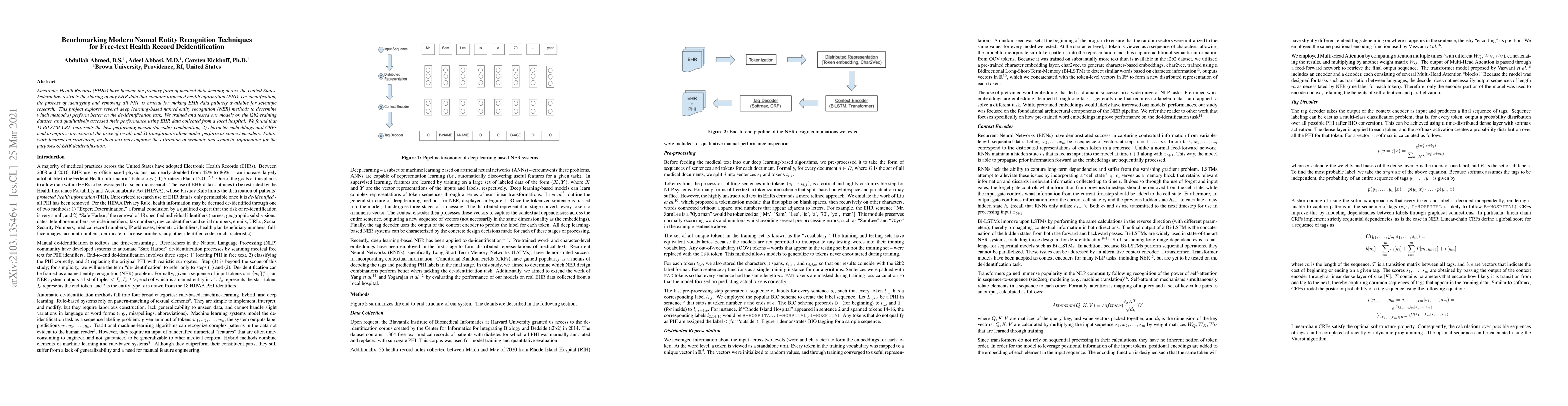 This study benchmarks modern NER techniques for de-identifying protected health information in EHRs, finding that BiLSTM-CRF performs best. It concludes that character-embeddings with CRFs boost precision but lower recall, while transformers fall short as context encoders.