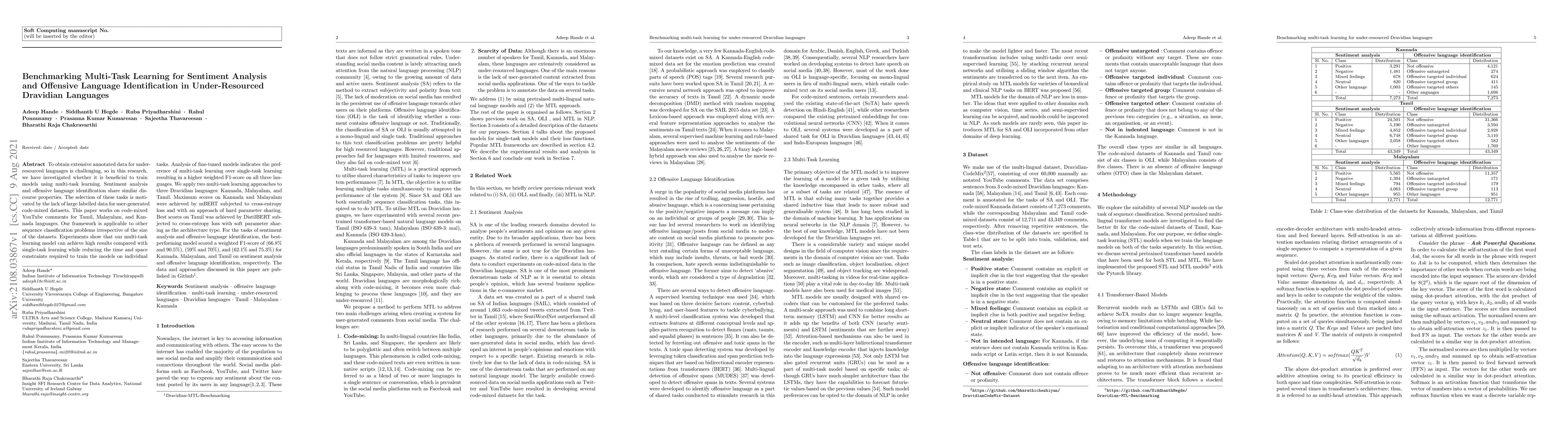 This paper benchmarks multi-task learning for sentiment analysis and offensive language identification in under-resourced Dravidian languages (Tamil, Malayalam, Kannada). The study finds that multi-task learning outperforms single-task learning, achieving higher F1-scores and reducing training constraints.