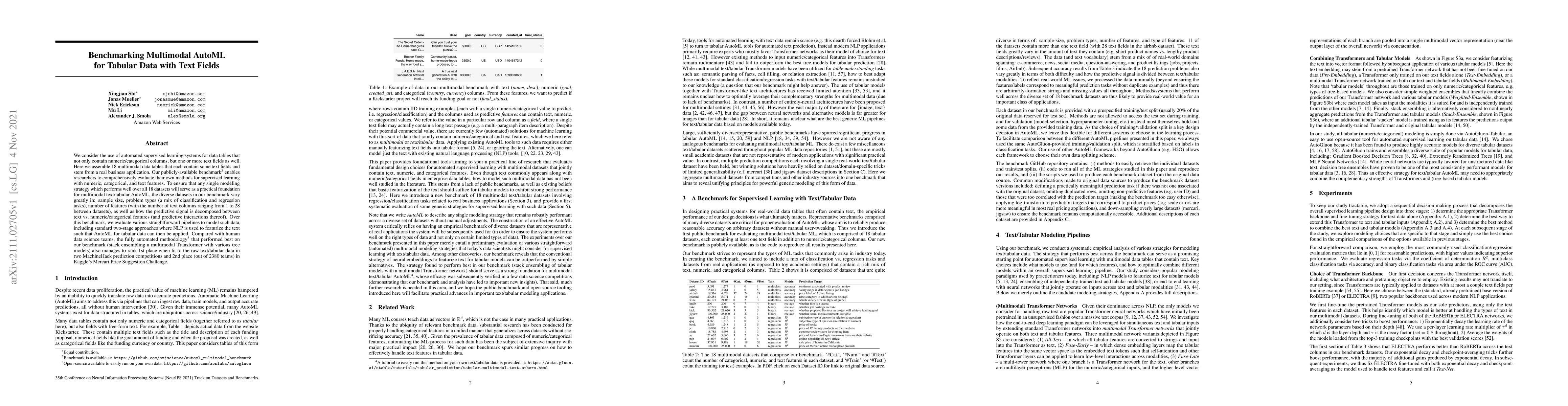 We consider the use of automated supervised learning systems for data tables that not only contain numeric/categorical columns, but one or more text fields as well. Here we assemble 18 multimodal data tables that each contain some text fields and stem from a real business application. Our publicly-available benchmark enables researchers to comprehensively evaluate their own methods for supervised learning with numeric, categorical, and text features. To ensure that any single modeling strategy which performs well over all 18 datasets will serve as a practical foundation for multimodal text/tabular AutoML, the diverse datasets in our benchmark vary greatly in: sample size, problem types (a mix of classification and regression tasks), number of features (with the number of text columns ranging from 1 to 28 between datasets), as well as how the predictive signal is decomposed between text vs. numeric/categorical features (and predictive interactions thereof). Over this benchmark, we evaluate various straightforward pipelines to model such data, including standard two-stage approaches where NLP is used to featurize the text such that AutoML for tabular data can then be applied. Compared with human data science teams, the fully automated methodology that performed best on our benchmark (stack ensembling a multimodal Transformer with various tree models) also manages to rank 1st place when fit to the raw text/tabular data in two MachineHack prediction competitions and 2nd place (out of 2380 teams) in Kaggle's Mercari Price Suggestion Challenge.