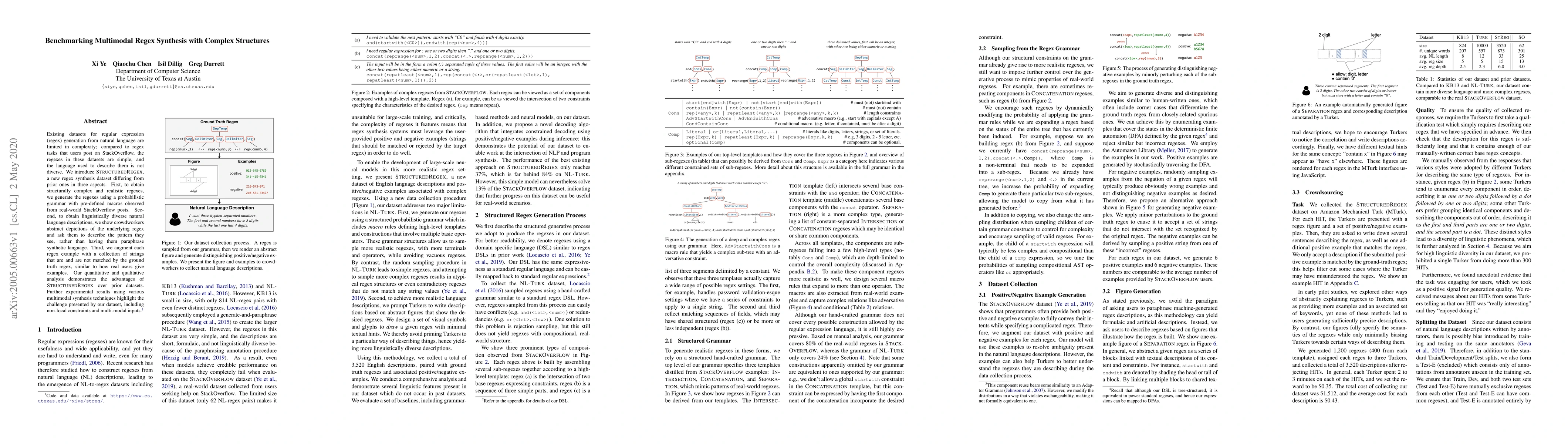 This paper introduces StructuredRegex, a new dataset for multimodal regex synthesis featuring complex, realistic regexes and diverse natural language descriptions, derived from real-world StackOverflow posts. The dataset challenges traditional synthesis techniques due to its non-local constraints and multi-modal inputs.