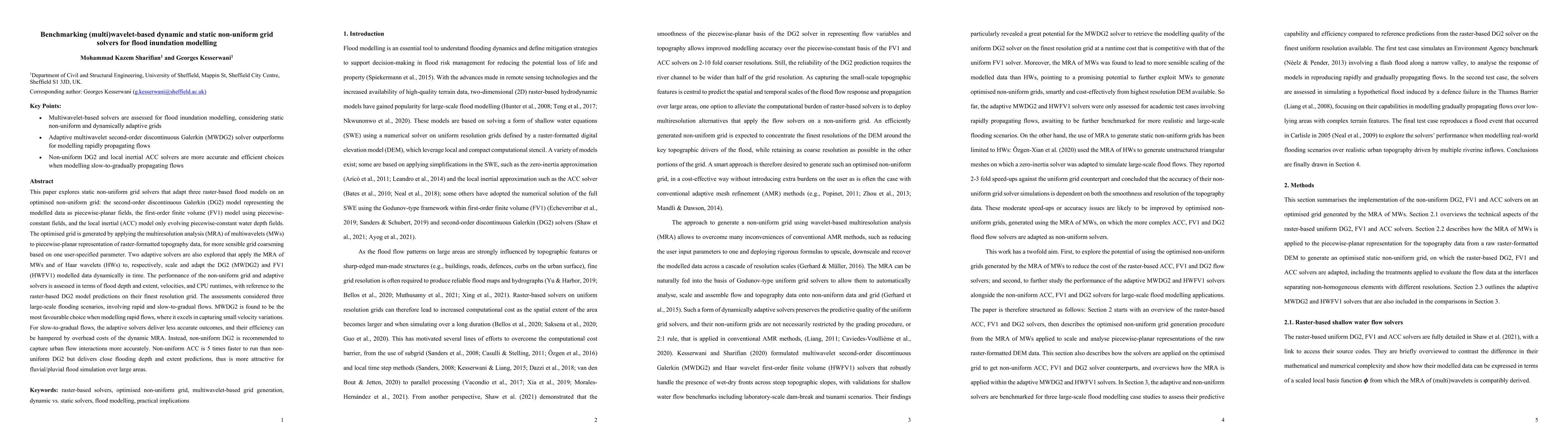 This paper explores static non-uniform grid solvers that adapt three raster-based flood models on an optimised non-uniform grid: the second-order discontinuous Galerkin (DG2) model representing the modelled data as piecewise-planar fields, the first-order finite volume (FV1) model using piecewise-constant fields, and the local inertial (ACC) model only evolving piecewise-constant water depth fields. The optimised grid is generated by applying the multiresolution analysis (MRA) of multiwavelets (MWs) to piecewise-planar representation of raster-formatted topography data, for more sensible grid coarsening based on one user-specified parameter. Two adaptive solvers are also explored that apply the MRA of MWs and of Haar wavelets (HWs) to, respectively, scale and adapt the DG2 (MWDG2) and FV1 (HWFV1) modelled data dynamically in time. The performance of the non-uniform grid and adaptive solvers is assessed in terms of flood depth and extent, velocities, and CPU runtimes, with reference to the raster-based DG2 model predictions on their finest resolution grid. The assessments considered three large-scale flooding scenarios, involving rapid and slow-to-gradual flows. MWDG2 is found to be the most favourable choice when modelling rapid flows, where it excels in capturing small velocity variations. For slow-to-gradual flows, the adaptive solvers deliver less accurate outcomes, and their efficiency can be hampered by overhead costs of the dynamic MRA. Instead, non-uniform DG2 is recommended to capture urban flow interactions more accurately. Non-uniform ACC is 5 times faster to run than non-uniform DG2 but delivers close flooding depth and extent predictions, thus is more attractive for fluvial/pluvial flood simulation over large areas.