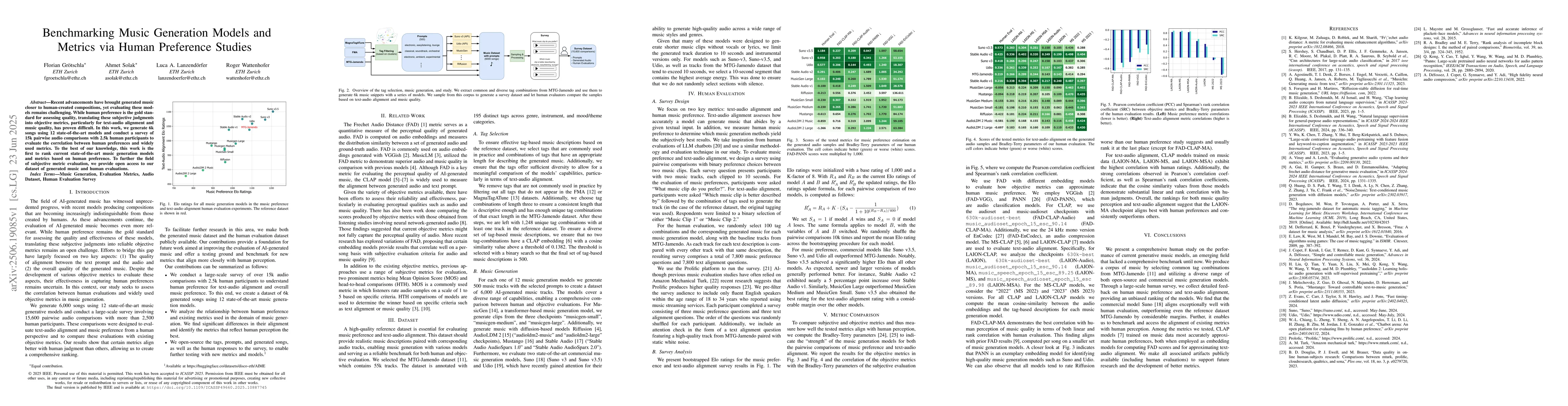 Recent advancements have brought generated music closer to human-created compositions, yet evaluating these models remains challenging. While human preference is the gold standard for assessing quality, translating these subjective judgments into objective metrics, particularly for text-audio alignment and music quality, has proven difficult. In this work, we generate 6k songs using 12 state-of-the-art models and conduct a survey of 15k pairwise audio comparisons with 2.5k human participants to evaluate the correlation between human preferences and widely used metrics. To the best of our knowledge, this work is the first to rank current state-of-the-art music generation models and metrics based on human preference. To further the field of subjective metric evaluation, we provide open access to our dataset of generated music and human evaluations.