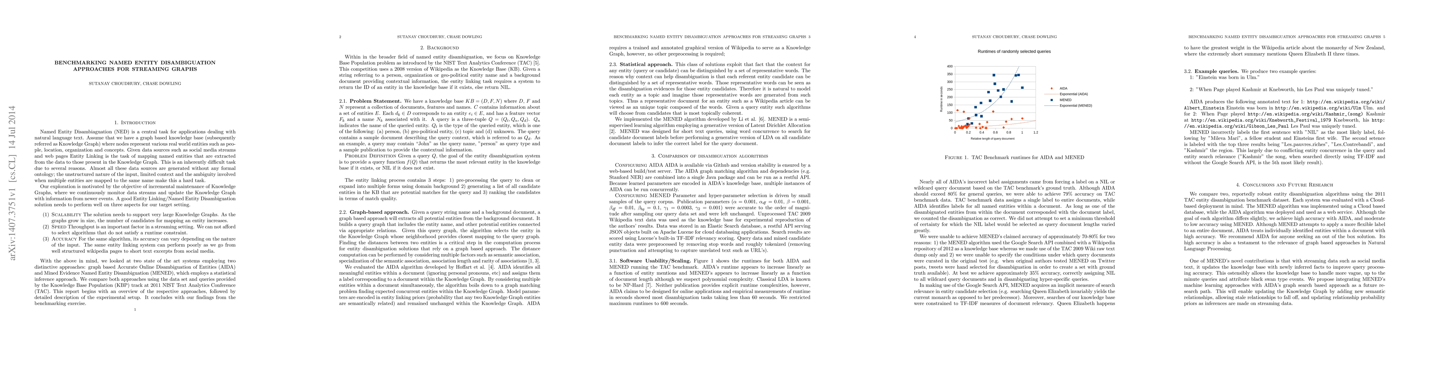 This paper benchmarks two named entity disambiguation (NED) approaches—AIDA and MENED—for streaming graphs using the 2011 NIST TAC KBP dataset. It compares their performance in mapping entities from unstructured data sources to a knowledge graph.