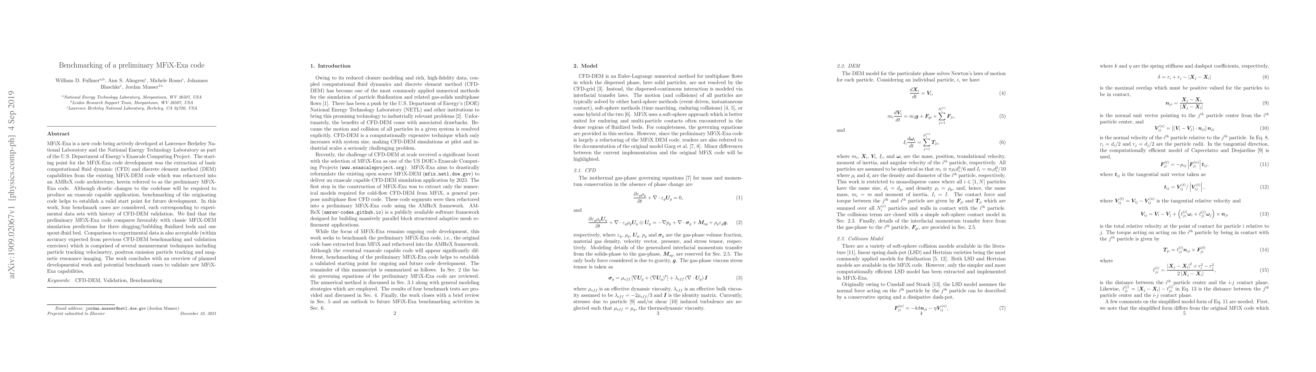 The preliminary MFiX-Exa code, developed for exascale computing, was benchmarked against classic MFiX-DEM simulations and experimental data for four fluidized bed cases. The results show favorable comparisons, establishing a valid starting point for future exascale-capable applications.