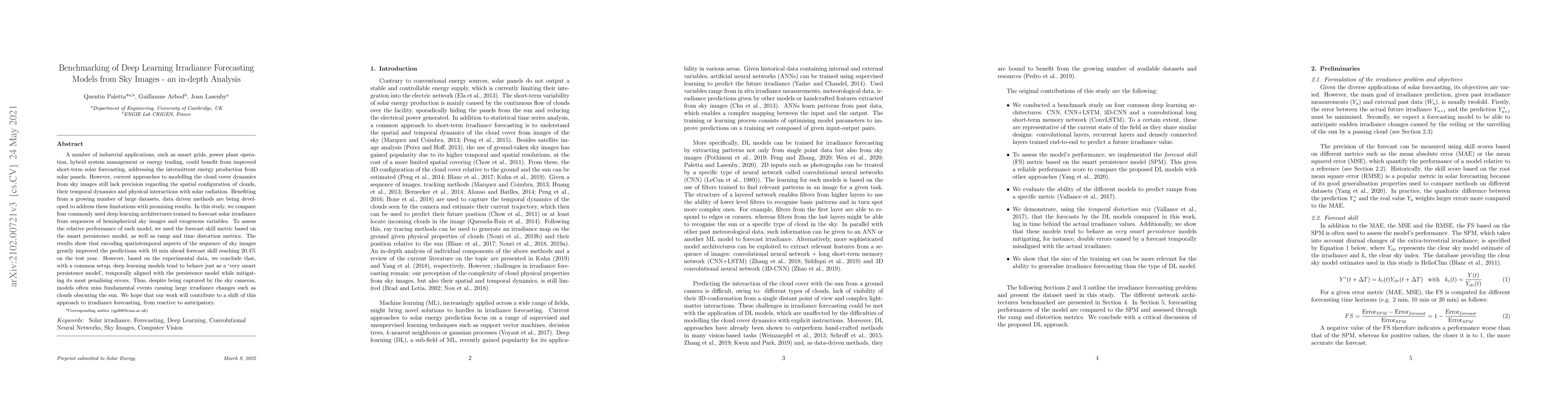 This study benchmarks four Deep Learning architectures for forecasting solar irradiance from sky images, finding that spatiotemporal encoding significantly improves predictions. Despite achieving 20.4% Forecast Skill, the models often mimic persistence models, missing fundamental cloud events causing large irradiance changes.