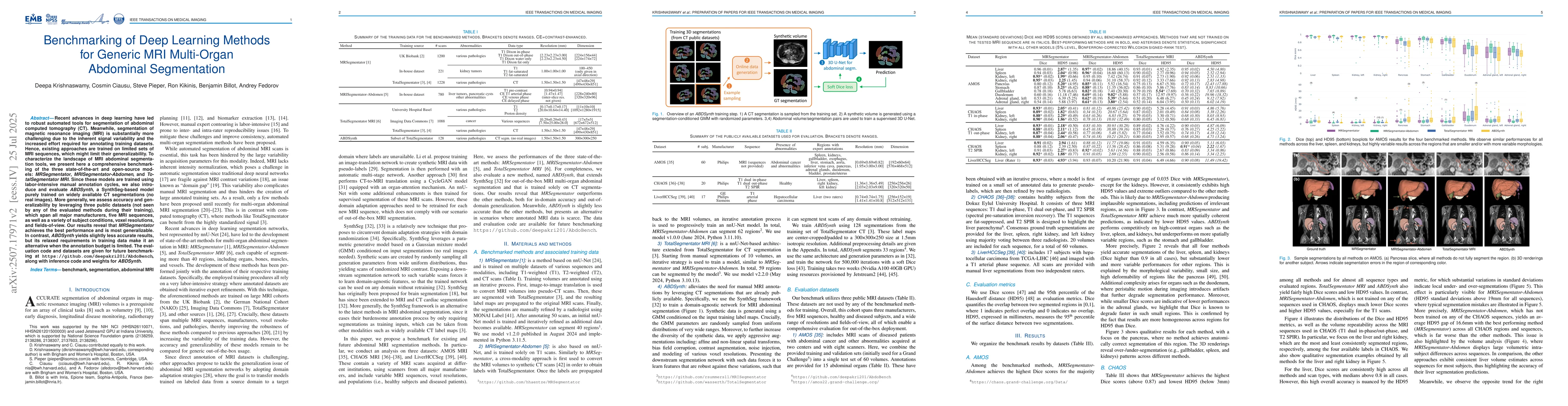 Recent advances in deep learning have led to robust automated tools for segmentation of abdominal computed tomography (CT). Meanwhile, segmentation of magnetic resonance imaging (MRI) is substantially more challenging due to the inherent signal variability and the increased effort required for annotating training datasets. Hence, existing approaches are trained on limited sets of MRI sequences, which might limit their generalizability. To characterize the landscape of MRI abdominal segmentation tools, we present here a comprehensive benchmarking of the three state-of-the-art and open-source models: MRSegmentator, MRISegmentator-Abdomen, and TotalSegmentator MRI. Since these models are trained using labor-intensive manual annotation cycles, we also introduce and evaluate ABDSynth, a SynthSeg-based model purely trained on widely available CT segmentations (no real images). More generally, we assess accuracy and generalizability by leveraging three public datasets (not seen by any of the evaluated methods during their training), which span all major manufacturers, five MRI sequences, as well as a variety of subject conditions, voxel resolutions, and fields-of-view. Our results reveal that MRSegmentator achieves the best performance and is most generalizable. In contrast, ABDSynth yields slightly less accurate results, but its relaxed requirements in training data make it an alternative when the annotation budget is limited. The evaluation code and datasets are given for future benchmarking at https://github.com/deepakri201/AbdoBench, along with inference code and weights for ABDSynth.