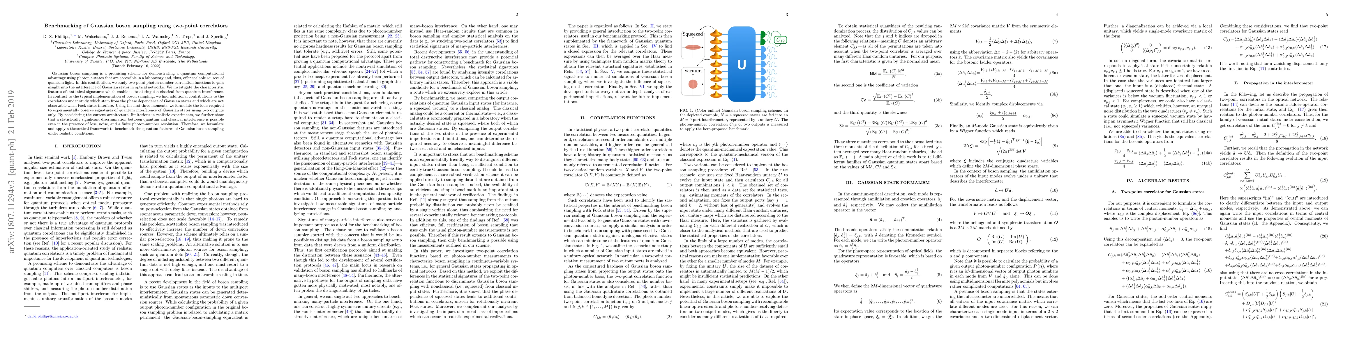This paper benchmarks Gaussian boson sampling by analyzing two-point photon-number correlators, revealing unique interference features of Gaussian states. It demonstrates that despite experimental imperfections, quantum interference can still be distinguished from classical interference using just two outputs.