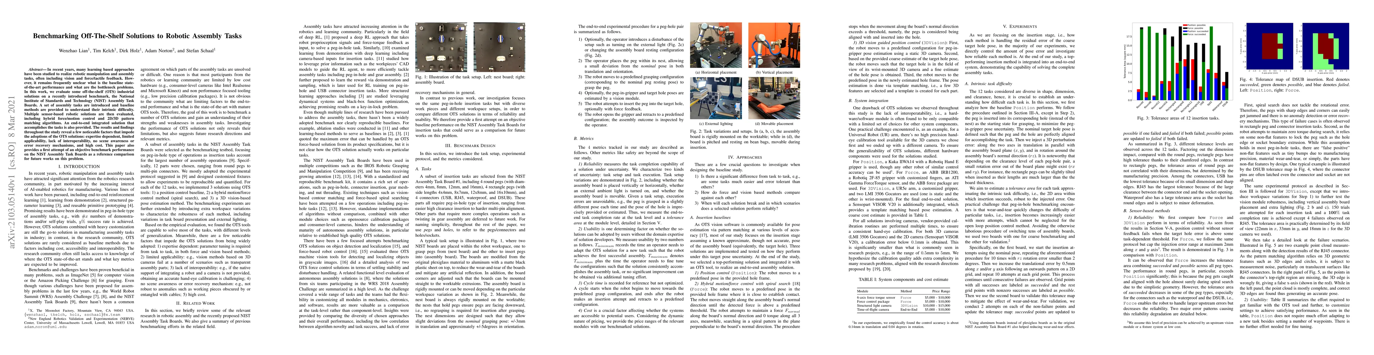 This paper evaluates various off-the-shelf robotic solutions for assembly tasks on the NIST Assembly Task Boards, identifying significant challenges such as high cost and lack of error recovery mechanisms. The study establishes a benchmark for future research in this domain.