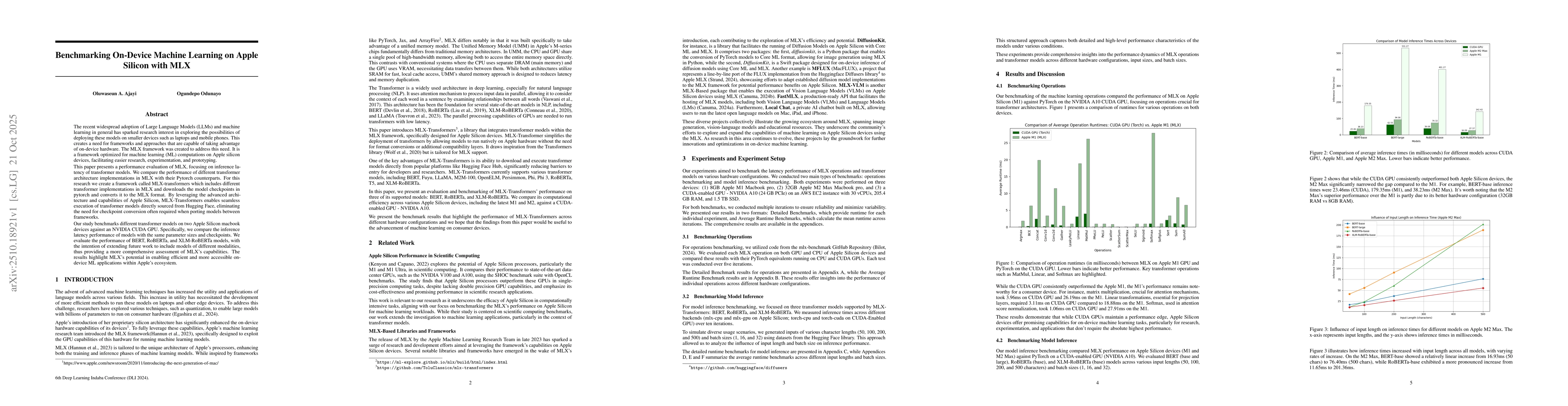 This study compares the performance of PyTorch and MLX frameworks across different hardware platforms (NVIDIA A10 GPU, Apple M1/M2 Max chip) for transformer-based models. It measures inference latency under varying input lengths and batch sizes.
