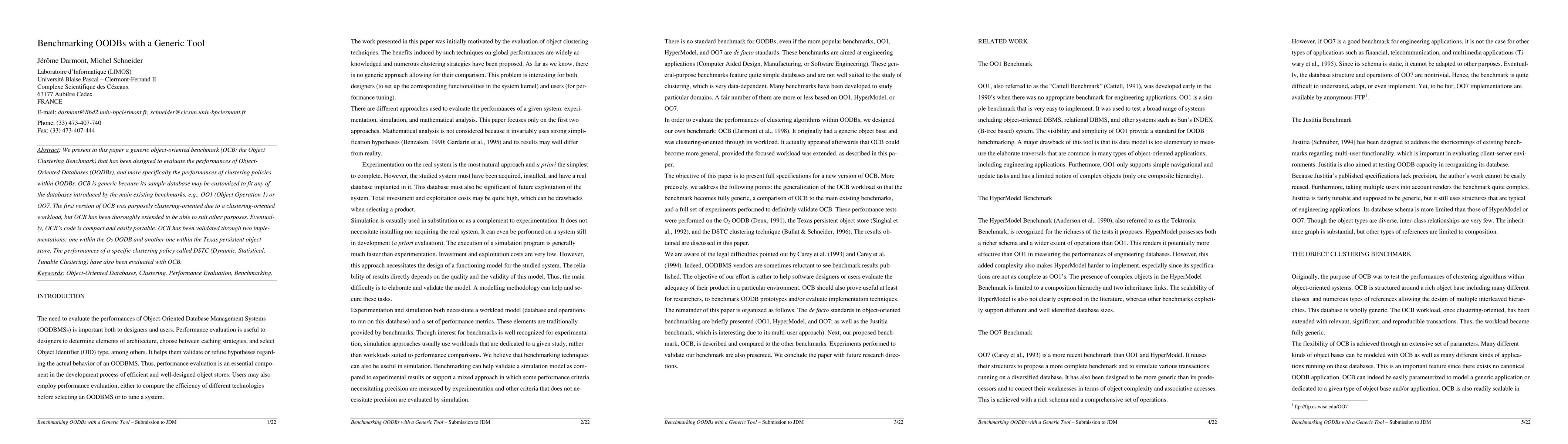 The paper introduces a customizable, portable benchmark tool, OCB (Object Clustering Benchmark), for evaluating Object-Oriented Database (OODB) performance, particularly clustering policies. It has been tested in O2 OODB and Texas persistent object store, and effectively assessed the DSTC clustering policy.