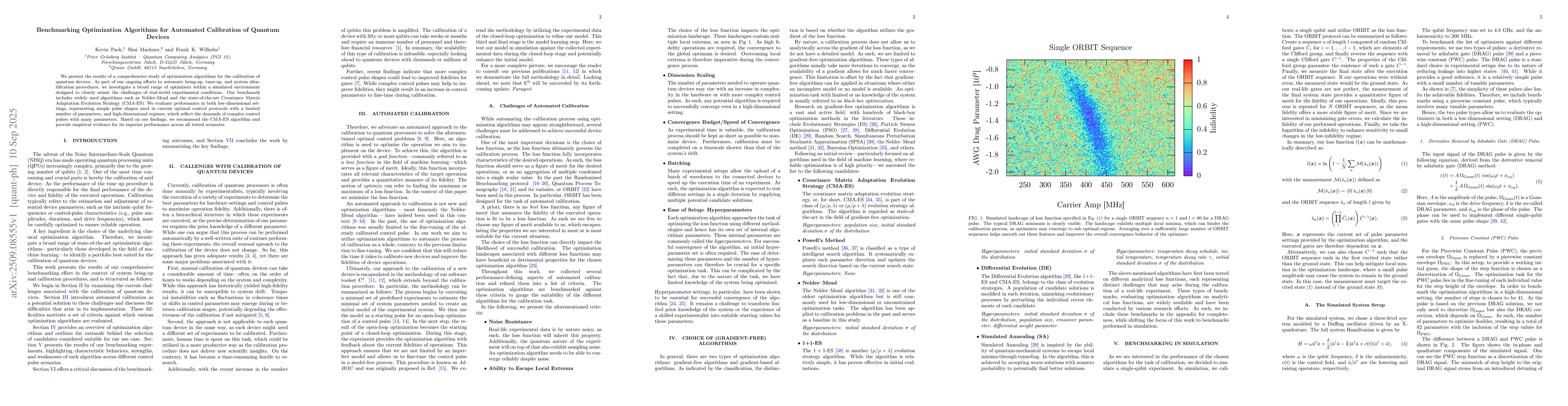 We present the results of a comprehensive study of optimization algorithms for the calibration of quantum devices. As part of our ongoing efforts to automate bring-up, tune-up, and system identification procedures, we investigate a broad range of optimizers within a simulated environment designed to closely mimic the challenges of real-world experimental conditions. Our benchmark includes widely used algorithms such as Nelder-Mead and the state-of-the-art Covariance Matrix Adaptation Evolution Strategy (CMA-ES). We evaluate performance in both low-dimensional settings, representing simple pulse shapes used in current optimal control protocols with a limited number of parameters, and high-dimensional regimes, which reflect the demands of complex control pulses with many parameters. Based on our findings, we recommend the CMA-ES algorithm and provide empirical evidence for its superior performance across all tested scenarios.