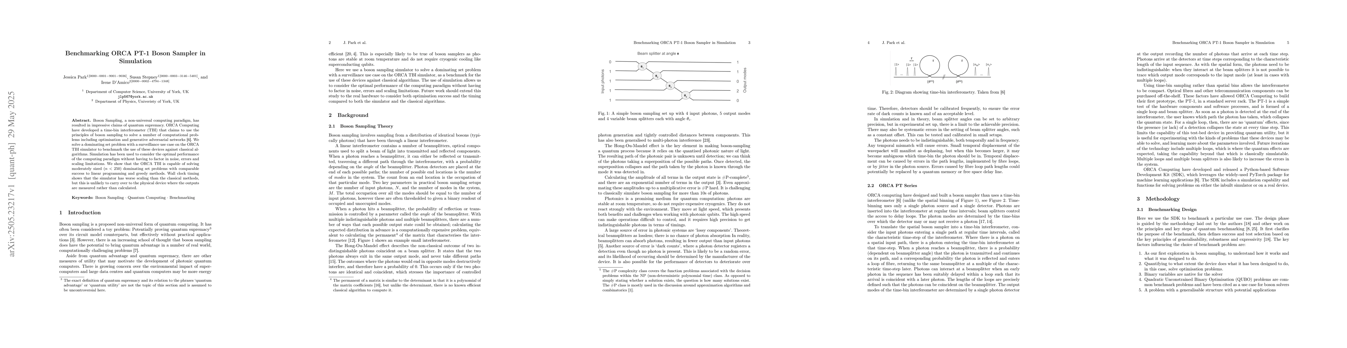 The research benchmarks the ORCA PT-1 Boson Sampler in simulation using a dominating set problem with a surveillance use case, comparing it against classical algorithms like linear programming and greedy methods.