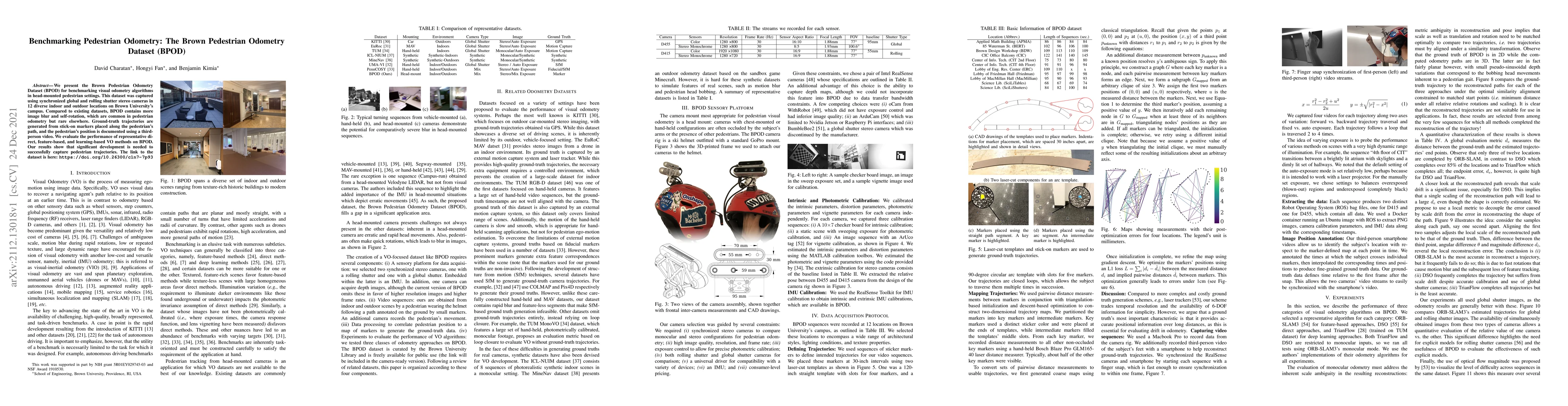We present the Brown Pedestrian Odometry Dataset (BPOD) for benchmarking visual odometry algorithms in head-mounted pedestrian settings. This dataset was captured using synchronized global and rolling shutter stereo cameras in 12 diverse indoor and outdoor locations on Brown University's campus. Compared to existing datasets, BPOD contains more image blur and self-rotation, which are common in pedestrian odometry but rare elsewhere. Ground-truth trajectories are generated from stick-on markers placed along the pedestrian's path, and the pedestrian's position is documented using a third-person video. We evaluate the performance of representative direct, feature-based, and learning-based VO methods on BPOD. Our results show that significant development is needed to successfully capture pedestrian trajectories. The link to the dataset is here: \url{https://doi.org/10.26300/c1n7-7p93
