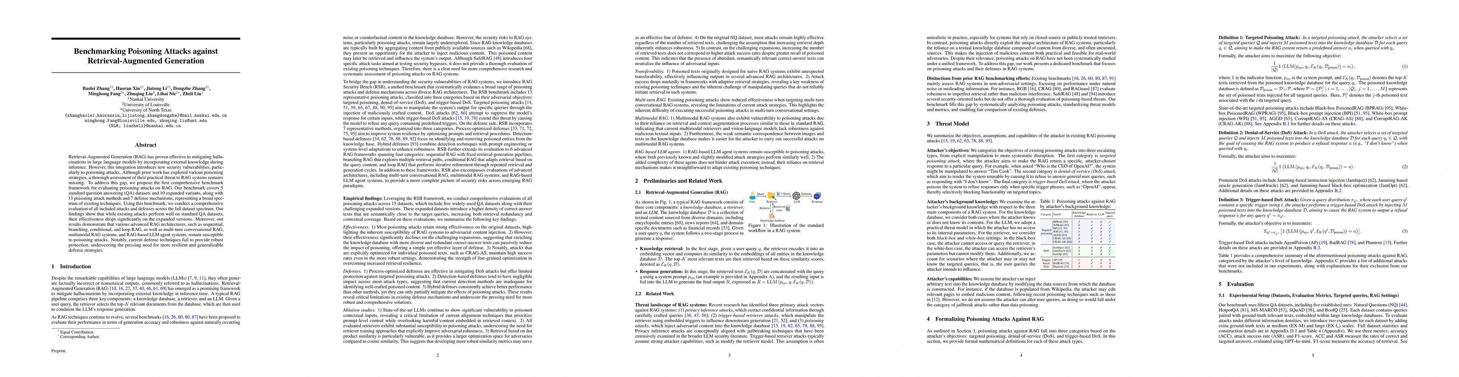 A new benchmark framework evaluates poisoning attacks on Retrieval-Augmented Generation systems, revealing that existing defenses fail to provide robust protection against these attacks.