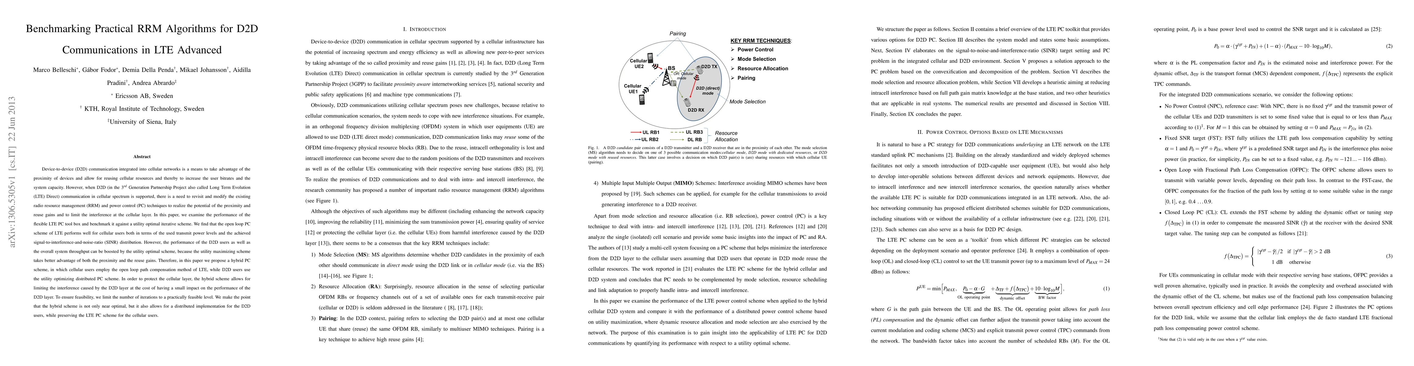 This paper benchmarks practical radio resource management algorithms for D2D communications in LTE, finding that while LTE's open loop power control works well for cellular users, a utility optimal scheme significantly boosts D2D performance and overall system throughput. The proposed hybrid scheme combines the two for optimal interference management.