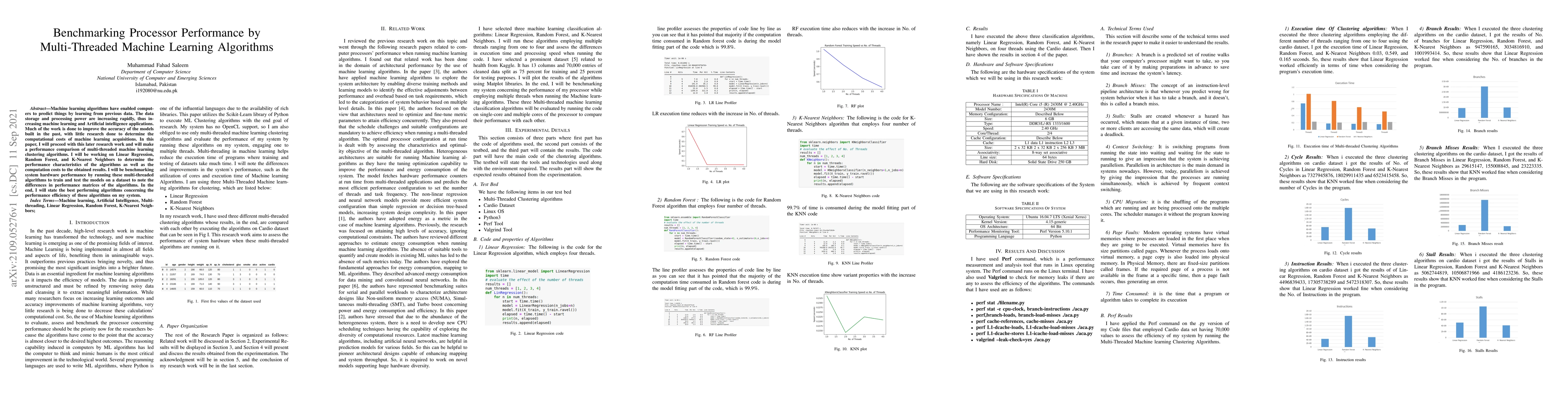 This paper benchmarks the performance of multi-threaded machine learning algorithms—Linear Regression, Random Forest, and K-Nearest Neighbors—to evaluate computational costs and efficiency. The study aims to identify the best-performing algorithms in terms of performance efficiency on the tested hardware.