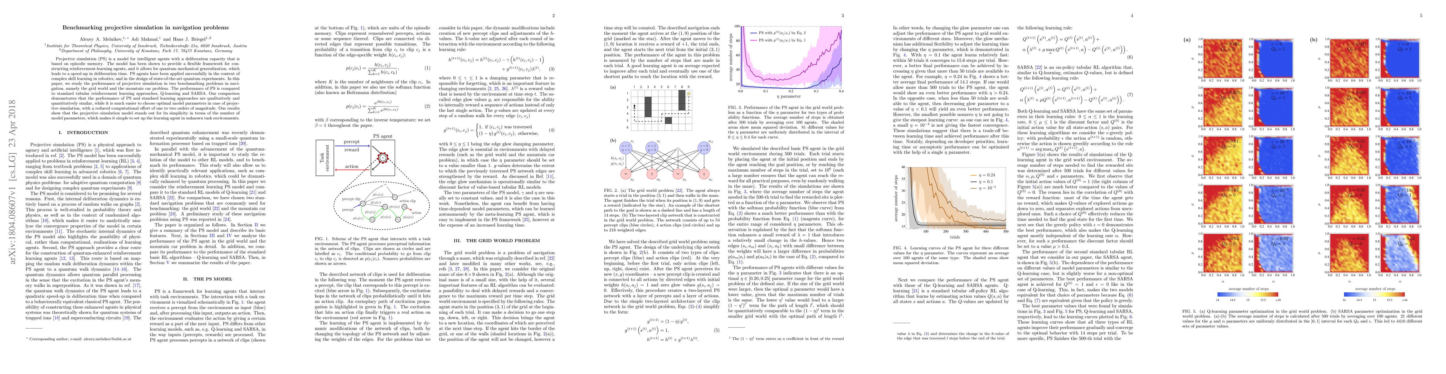 Projective simulation (PS) is a model for intelligent agents with a deliberation capacity that is based on episodic memory. The model has been shown to provide a flexible framework for constructing reinforcement-learning agents, and it allows for quantum mechanical generalization, which leads to a speed-up in deliberation time. PS agents have been applied successfully in the context of complex skill learning in robotics, and in the design of state-of-the-art quantum experiments. In this paper, we study the performance of projective simulation in two benchmarking problems in navigation, namely the grid world and the mountain car problem. The performance of PS is compared to standard tabular reinforcement learning approaches, Q-learning and SARSA. Our comparison demonstrates that the performance of PS and standard learning approaches are qualitatively and quantitatively similar, while it is much easier to choose optimal model parameters in case of projective simulation, with a reduced computational effort of one to two orders of magnitude. Our results show that the projective simulation model stands out for its simplicity in terms of the number of model parameters, which makes it simple to set up the learning agent in unknown task environments.