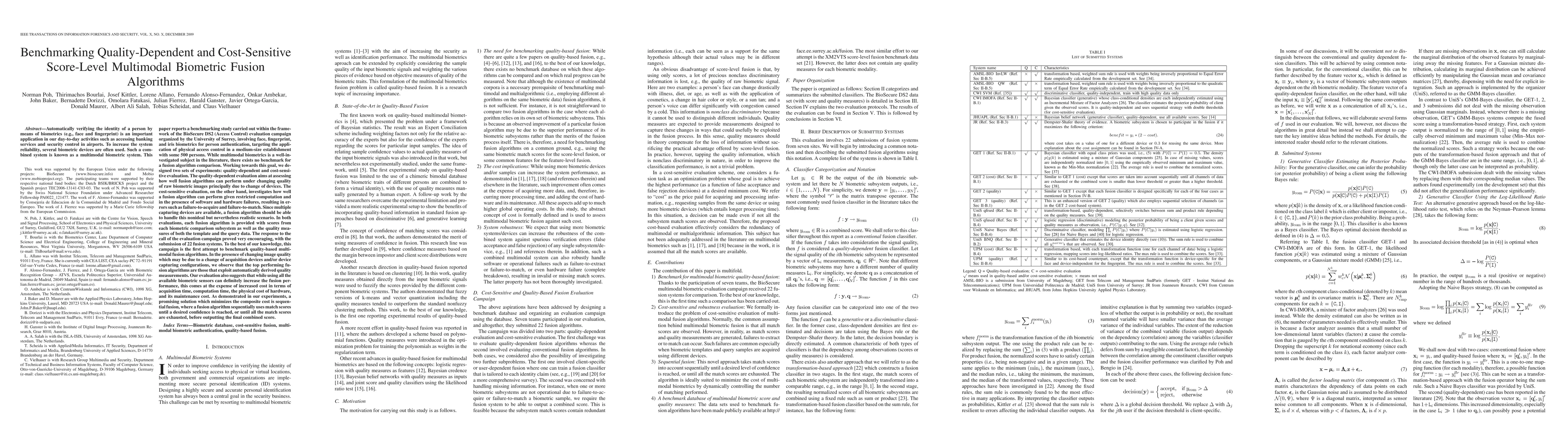 Automatically verifying the identity of a person by means of biometrics is an important application in day-to-day activities such as accessing banking services and security control in airports. To increase the system reliability, several biometric devices are often used. Such a combined system is known as a multimodal biometric system. This paper reports a benchmarking study carried out within the framework of the BioSecure DS2 (Access Control) evaluation campaign organized by the University of Surrey, involving face, fingerprint, and iris biometrics for person authentication, targeting the application of physical access control in a medium-size establishment with some 500 persons. While multimodal biometrics is a well-investigated subject, there exists no benchmark for a fusion algorithm comparison. Working towards this goal, we designed two sets of experiments: quality-dependent and cost-sensitive evaluation. The quality-dependent evaluation aims at assessing how well fusion algorithms can perform under changing quality of raw images principally due to change of devices. The cost-sensitive evaluation, on the other hand, investigates how well a fusion algorithm can perform given restricted computation and in the presence of software and hardware failures, resulting in errors such as failure-to-acquire and failure-to-match. Since multiple capturing devices are available, a fusion algorithm should be able to handle this nonideal but nevertheless realistic scenario. In both evaluations, each fusion algorithm is provided with scores from each biometric comparison subsystem as well as the quality measures of both template and query data. The response to the call of the campaign proved very encouraging, with the submission of 22 fusion systems. To the best of our knowledge, this is the first attempt to benchmark quality-based multimodal fusion algorithms.