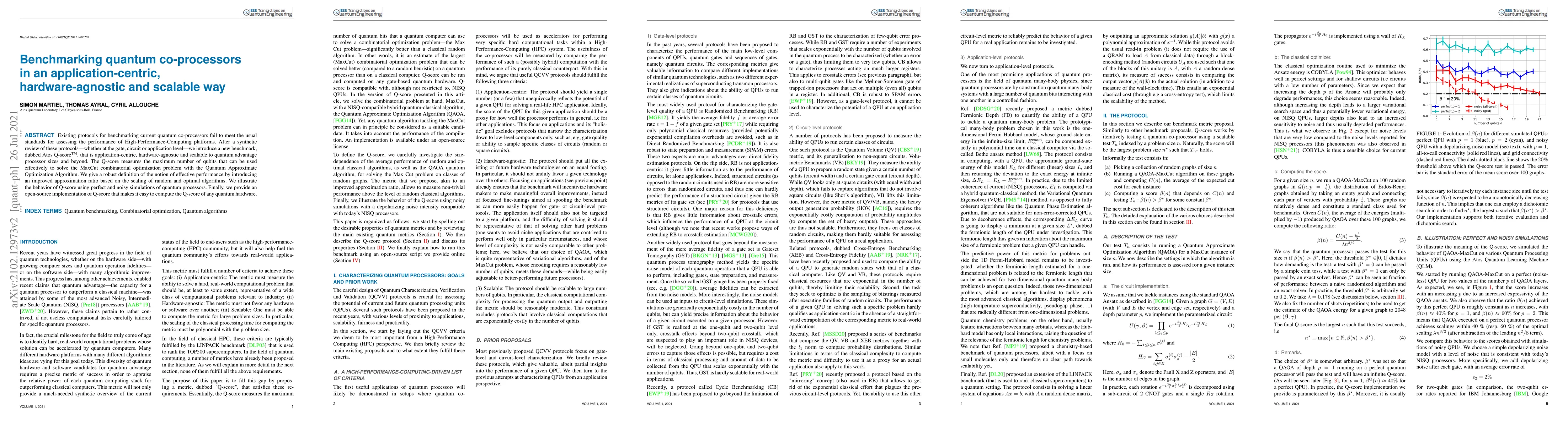 This paper introduces a new benchmark, Atos Q-score, for evaluating quantum co-processors that is application-centric, hardware-agnostic, and scalable. The Q-score measures the effective use of qubits in solving the MaxCut problem, providing a robust definition of performance based on improved approximation ratios.