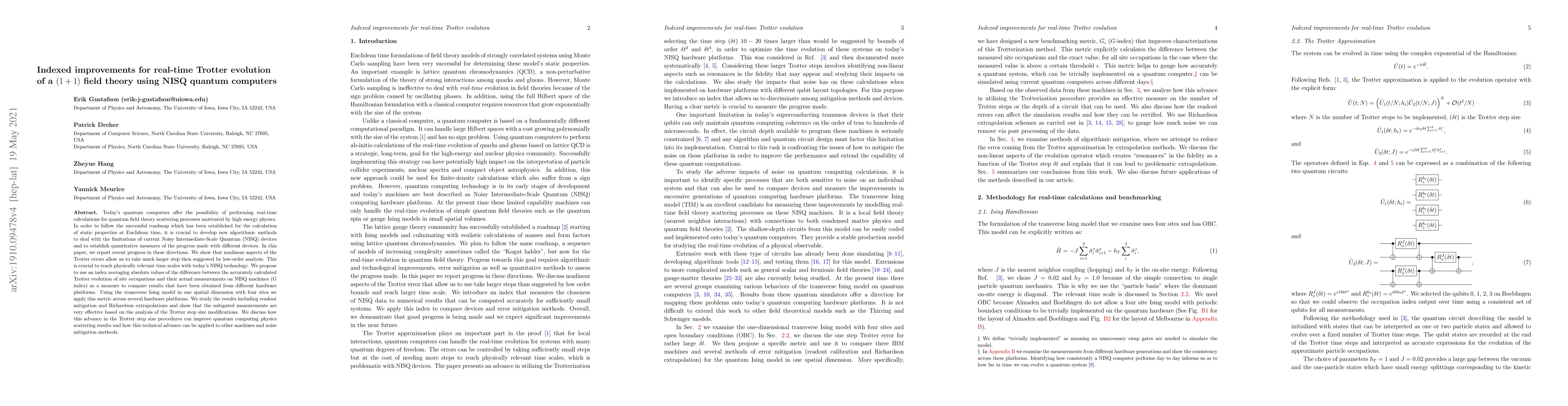 Quantum computers open the possibility of performing real-time calculations for quantum field theory scattering processes. We propose to use an index averaging the absolute value of the difference between the accurately calculated Trotter evolution of site occupations and their actual measurements on NISQ machines. The average is over all the qubits for a certain number of Trotter steps. We use this metric to quantify the progress made in successive state-of-the-art machines and error-mitigation techniques. We illustrate the concept with the transverse Ising model in one spatial dimension with four sites using three of IBM's quantum computers (Almaden, Boeblingen, and Melbourne). We discuss the size of the Trotter steps needed to achieve physics goals. Using the proposed metric, we show that readout mitigation methods and Richardson extrapolations of mitigated measurements are very effective for specific numbers of Trotter steps of a chosen size. This specific choice can be applied to other machines and noise mitigation methods. On the other hand, a reliable algorithmic mitigation would require a significantly larger number of smaller Trotter steps.