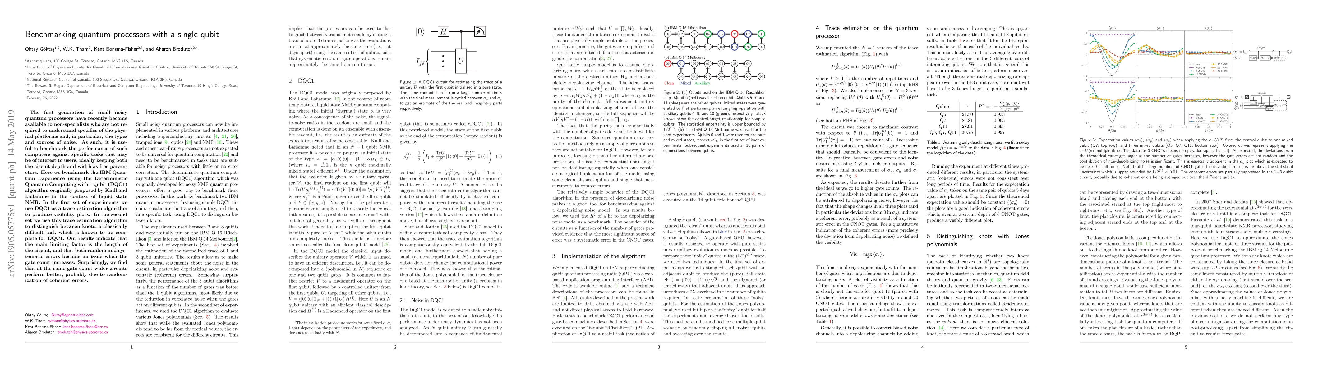 The first generation of small noisy quantum processors have recently become available to non-specialists who are not required to understand specifics of the physical platforms and, in particular, the types and sources of noise. As such, it is useful to benchmark the performance of such computers against specific tasks that may be of interest to users, ideally keeping both the circuit depth and width as free parameters. Here we benchmark the IBM Quantum Experience using the Deterministic Quantum Computing with 1 qubit (DQC1) algorithm originally proposed by Knill and Laflamme in the context of liquid state NMR. In the first set of experiments we use DQC1 as a trace estimation algorithm to produce visibility plots. In the second set we use this trace estimation algorithm to distinguish between knots, a classically difficult task which is known to be complete for DQC1. Our results indicate that the main limiting factor is the length of the circuit, and that both random and systematic errors become an issue when the gate count increases. Surprisingly, we find that at the same gate count wider circuits perform better, probably due to randomization of coherent errors.