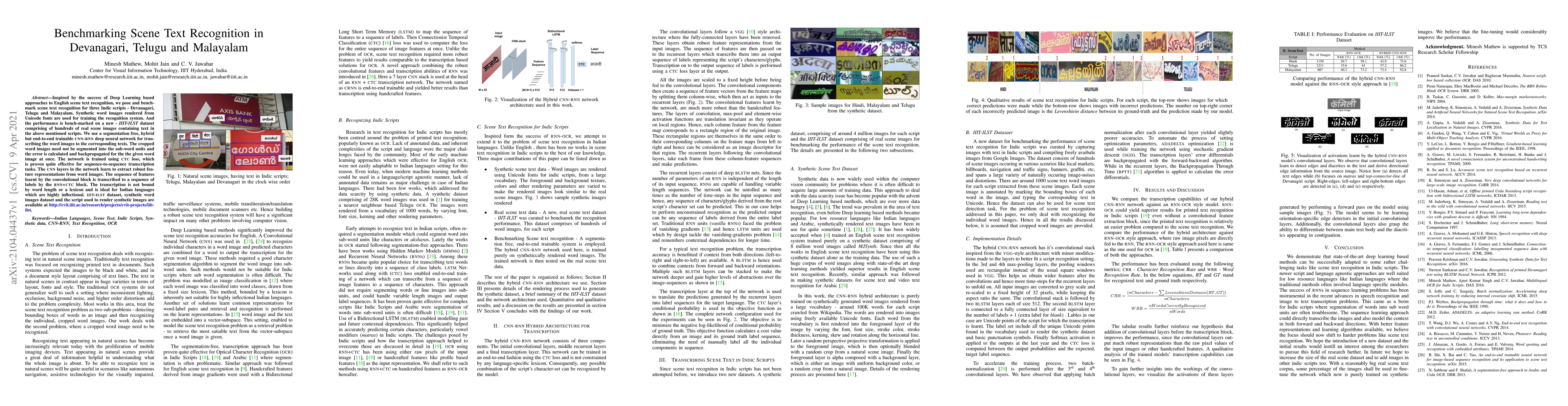 This research benchmarks scene text recognition for three Indic scripts—Devanagari, Telugu, and Malayalam—using a deep neural network. The study employs a CNN-RNN model with CTC loss for end-to-end transcription of synthetic and real scene text images, demonstrating its effectiveness on a new dataset, IIIT-ILST. The dataset and synthetic images are publicly available for further research.