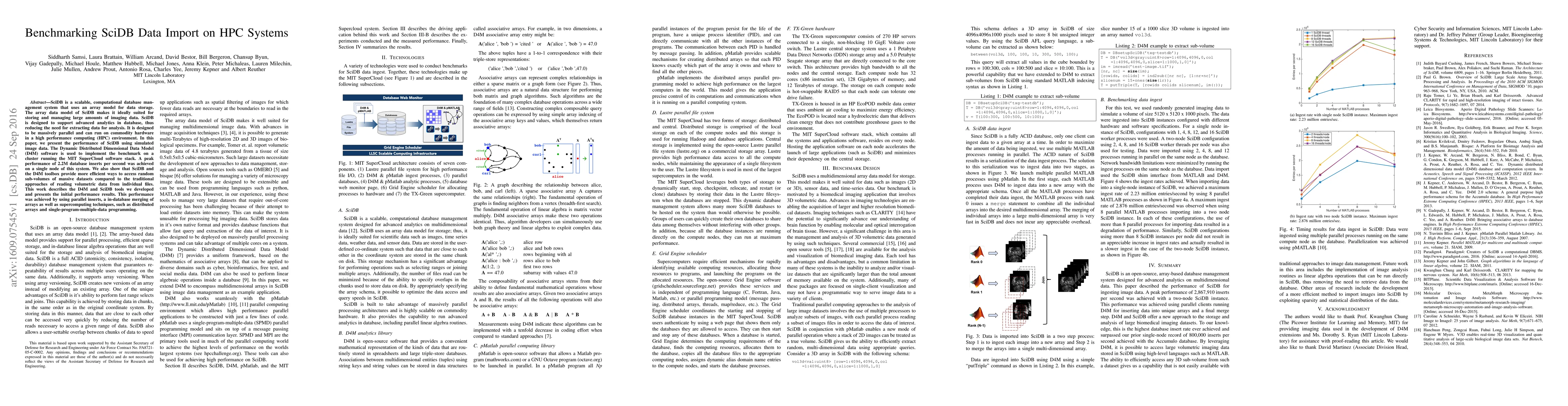 SciDB is a scalable, computational database management system that uses an array model for data storage. The array data model of SciDB makes it ideally suited for storing and managing large amounts of imaging data. SciDB is designed to support advanced analytics in database, thus reducing the need for extracting data for analysis. It is designed to be massively parallel and can run on commodity hardware in a high performance computing (HPC) environment. In this paper, we present the performance of SciDB using simulated image data. The Dynamic Distributed Dimensional Data Model (D4M) software is used to implement the benchmark on a cluster running the MIT SuperCloud software stack. A peak performance of 2.2M database inserts per second was achieved on a single node of this system. We also show that SciDB and the D4M toolbox provide more efficient ways to access random sub-volumes of massive datasets compared to the traditional approaches of reading volumetric data from individual files. This work describes the D4M and SciDB tools we developed and presents the initial performance results. This performance was achieved by using parallel inserts, a in-database merging of arrays as well as supercomputing techniques, such as distributed arrays and single-program-multiple-data programming.