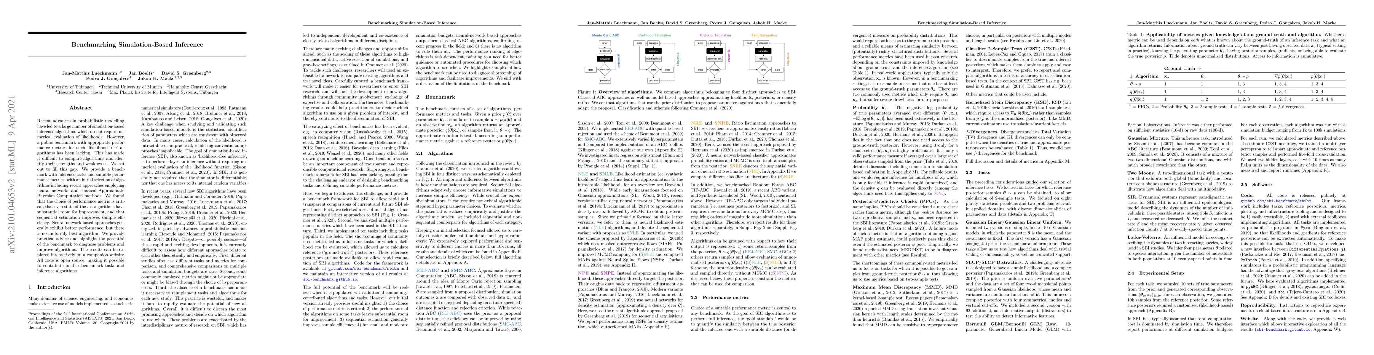 Recent advances in probabilistic modelling have led to a large number of simulation-based inference algorithms which do not require numerical evaluation of likelihoods. However, a public benchmark with appropriate performance metrics for such 'likelihood-free' algorithms has been lacking. This has made it difficult to compare algorithms and identify their strengths and weaknesses. We set out to fill this gap: We provide a benchmark with inference tasks and suitable performance metrics, with an initial selection of algorithms including recent approaches employing neural networks and classical Approximate Bayesian Computation methods. We found that the choice of performance metric is critical, that even state-of-the-art algorithms have substantial room for improvement, and that sequential estimation improves sample efficiency. Neural network-based approaches generally exhibit better performance, but there is no uniformly best algorithm. We provide practical advice and highlight the potential of the benchmark to diagnose problems and improve algorithms. The results can be explored interactively on a companion website. All code is open source, making it possible to contribute further benchmark tasks and inference algorithms.