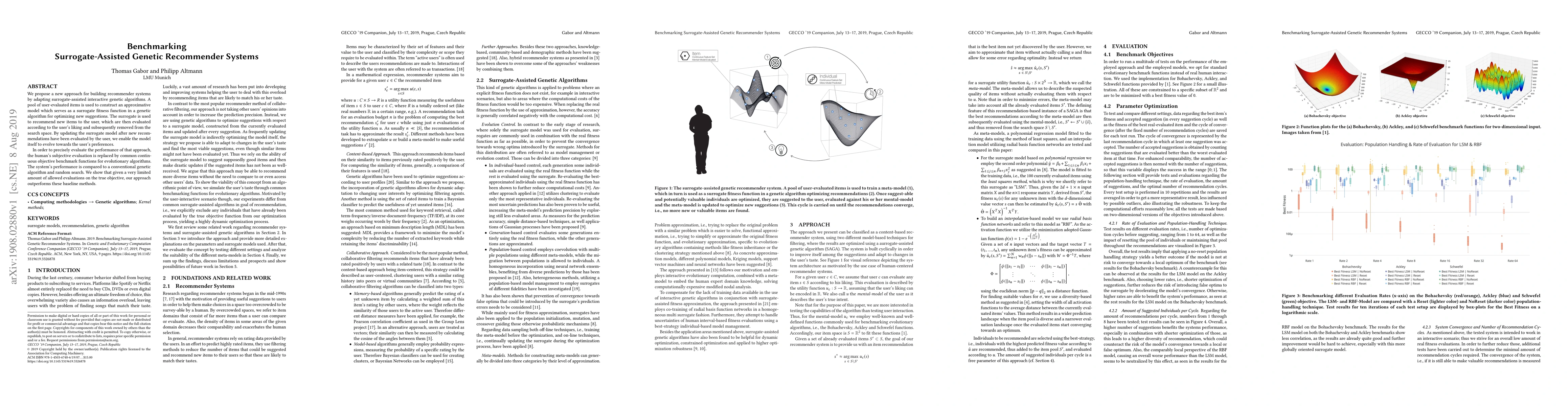 This paper proposes a surrogate-assisted genetic algorithm for recommender systems, using user evaluations to evolve a model that optimizes new suggestions. It benchmarks this approach against conventional genetic algorithms and random search, demonstrating superior performance with limited evaluations.