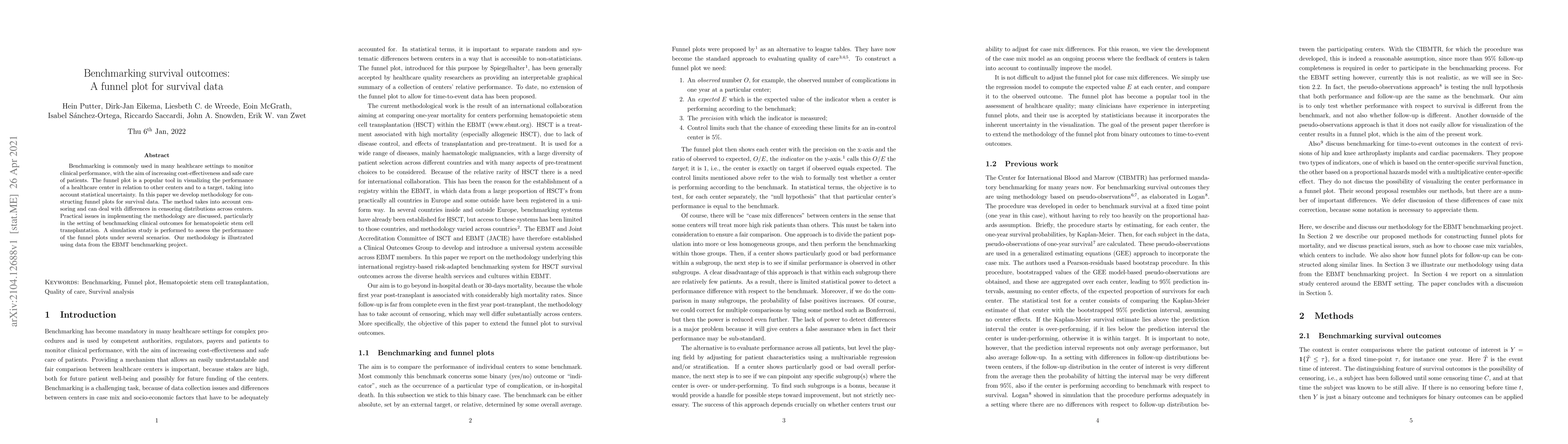 Benchmarking is commonly used in many healthcare settings to monitor clinical performance, with the aim of increasing cost-effectiveness and safe care of patients. The funnel plot is a popular tool in visualizing the performance of a healthcare center in relation to other centers and to a target, taking into account statistical uncertainty. In this paper we develop methodology for constructing funnel plots for survival data. The method takes into account censoring and can deal with differences in censoring distributions across centers. Practical issues in implementing the methodology are discussed, particularly in the setting of benchmarking clinical outcomes for hematopoietic stem cell transplantation. A simulation study is performed to assess the performance of the funnel plots under several scenarios. Our methodology is illustrated using data from the EBMT benchmarking project.