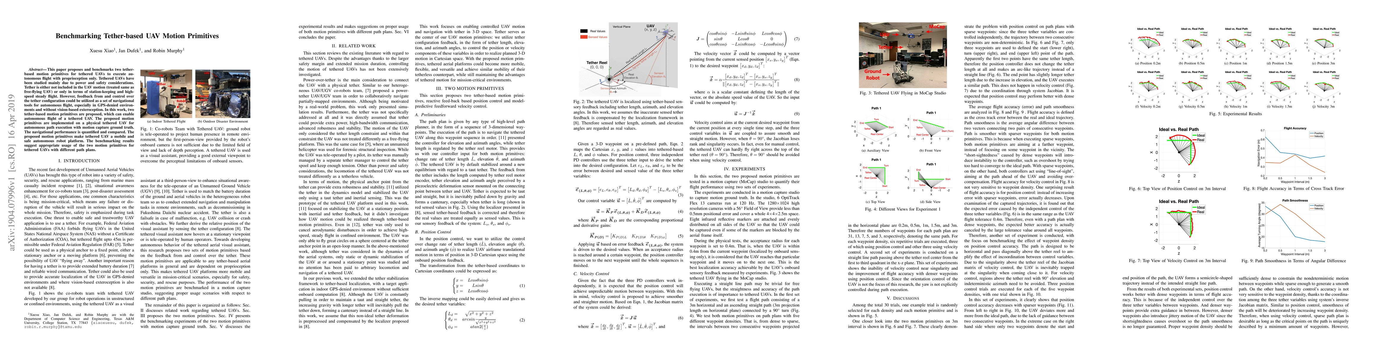 This paper proposes and benchmarks two tether-based motion primitives for tethered UAVs to execute autonomous flight with proprioception only. Tethered UAVs have been studied mainly due to power and safety considerations. Tether is either not included in the UAV motion (treated same as free-flying UAV) or only in terms of station-keeping and high-speed steady flight. However, feedback from and control over the tether configuration could be utilized as a set of navigational tools for autonomous flight, especially in GPS-denied environments and without vision-based exteroception. In this work, two tether-based motion primitives are proposed, which can enable autonomous flight of a tethered UAV. The proposed motion primitives are implemented on a physical tethered UAV for autonomous path execution with motion capture ground truth. The navigational performance is quantified and compared. The proposed motion primitives make tethered UAV a mobile and safe autonomous robot platform. The benchmarking results suggest appropriate usage of the two motion primitives for tethered UAVs with different path plans.