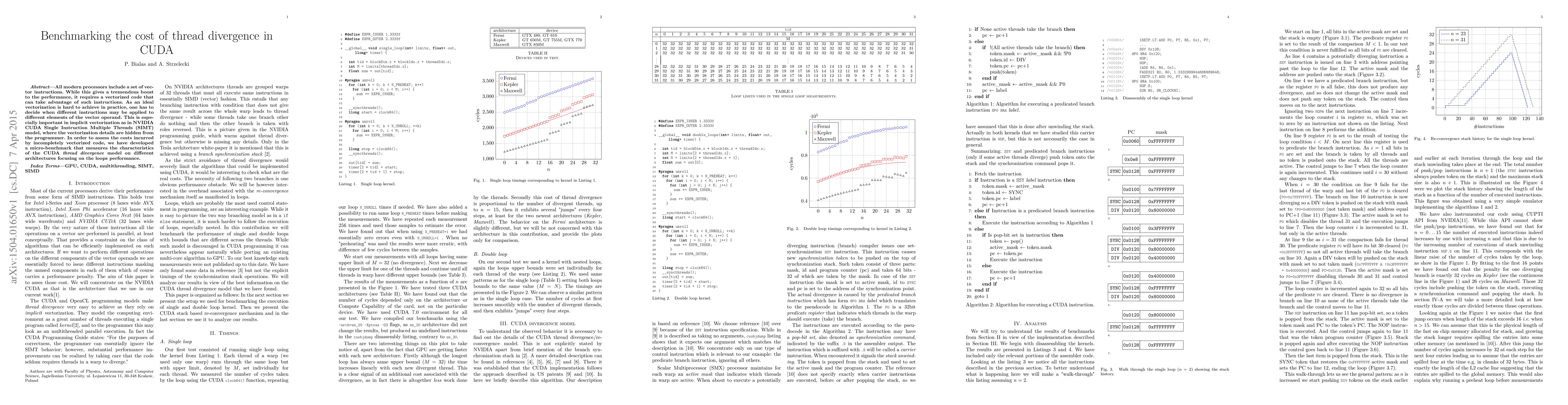 This paper benchmarks the cost of thread divergence in CUDA, developing a micro-benchmark to measure the performance impacts of incompletely vectorized code on different architectures, particularly in CUDA's SIMT model. The study highlights the performance penalties associated with thread divergence in vectorized loops.
