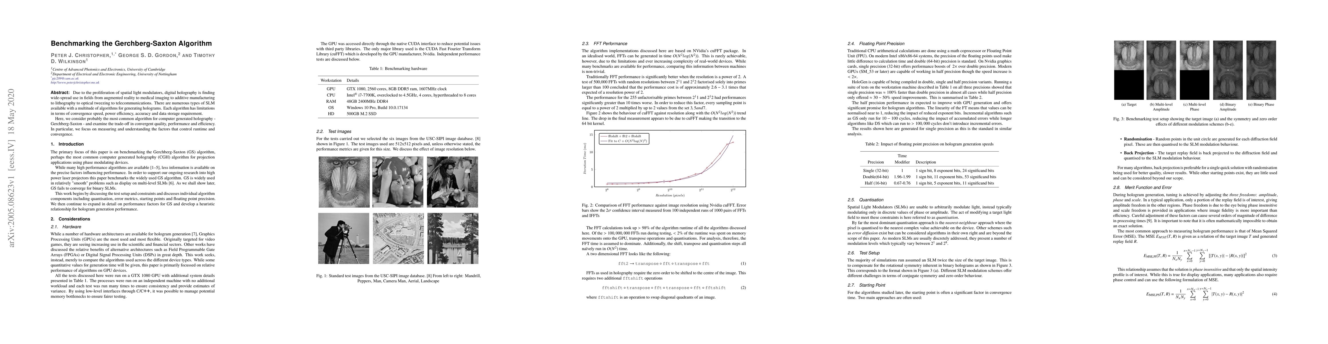This paper benchmarks the Gerchberg-Saxton algorithm, a prevalent method for computer-generated holography, assessing its performance in terms of convergence speed, power efficiency, accuracy, and data storage requirements. The study aims to identify factors influencing runtime and convergence quality.