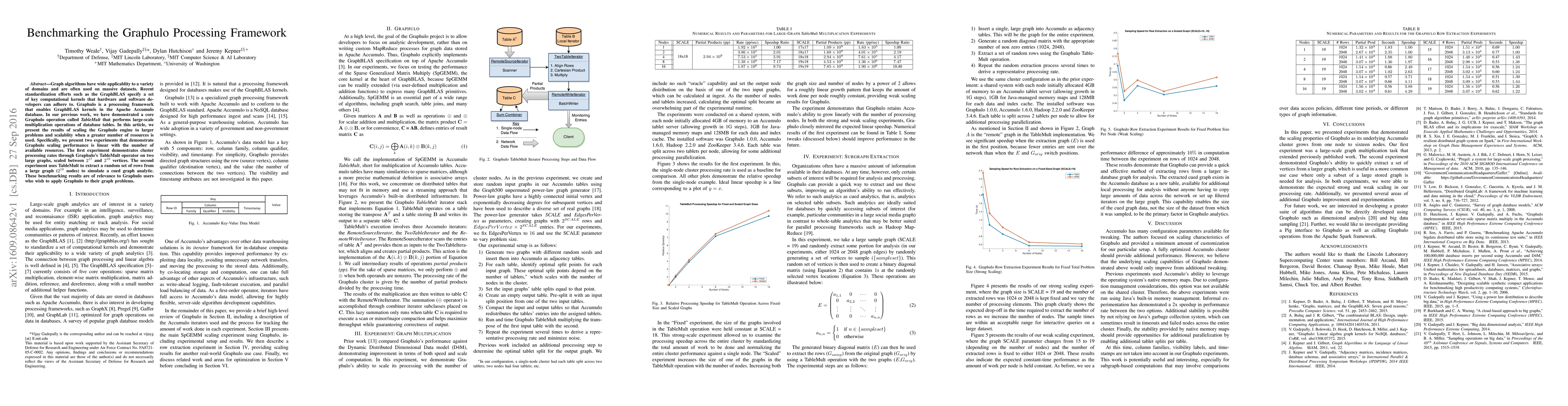 This paper benchmarks the Graphulo processing framework, demonstrating its linear scalability with increased resources through two experiments: one on large-scale graph multiplication and another on extracting a random subset of rows from a large graph. The results show Graphulo's efficiency for users tackling complex graph problems.