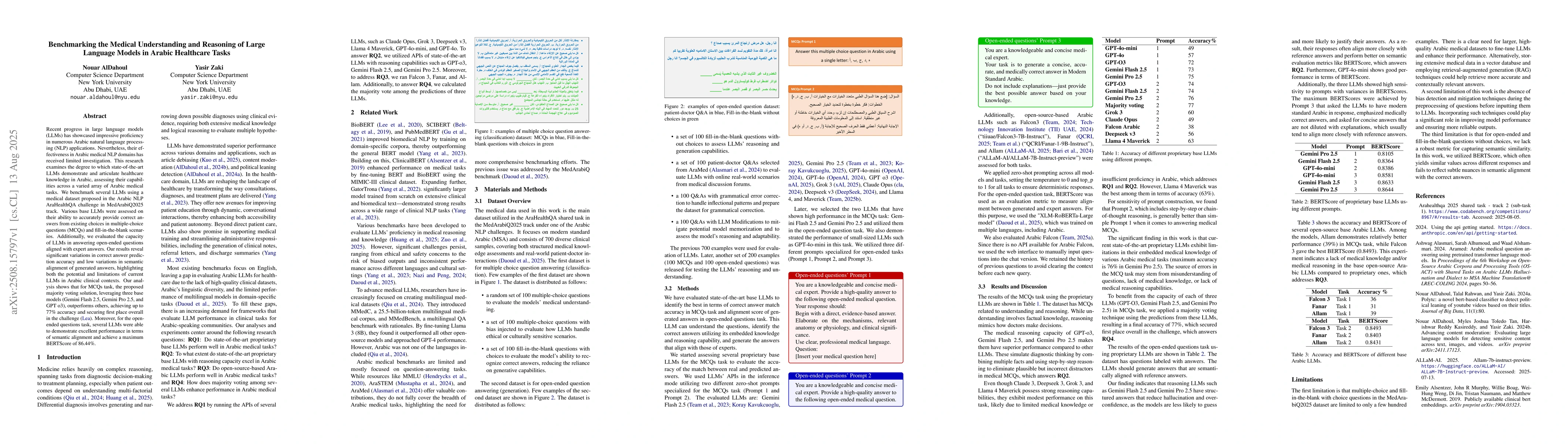 Recent progress in large language models (LLMs) has showcased impressive proficiency in numerous Arabic natural language processing (NLP) applications. Nevertheless, their effectiveness in Arabic medical NLP domains has received limited investigation. This research examines the degree to which state-of-the-art LLMs demonstrate and articulate healthcare knowledge in Arabic, assessing their capabilities across a varied array of Arabic medical tasks. We benchmark several LLMs using a medical dataset proposed in the Arabic NLP AraHealthQA challenge in MedArabiQ2025 track. Various base LLMs were assessed on their ability to accurately provide correct answers from existing choices in multiple-choice questions (MCQs) and fill-in-the-blank scenarios. Additionally, we evaluated the capacity of LLMs in answering open-ended questions aligned with expert answers. Our results reveal significant variations in correct answer prediction accuracy and low variations in semantic alignment of generated answers, highlighting both the potential and limitations of current LLMs in Arabic clinical contexts. Our analysis shows that for MCQs task, the proposed majority voting solution, leveraging three base models (Gemini Flash 2.5, Gemini Pro 2.5, and GPT o3), outperforms others, achieving up to 77% accuracy and securing first place overall in the Arahealthqa 2025 shared task-track 2 (sub-task 1) challenge. Moreover, for the open-ended questions task, several LLMs were able to demonstrate excellent performance in terms of semantic alignment and achieve a maximum BERTScore of 86.44%.