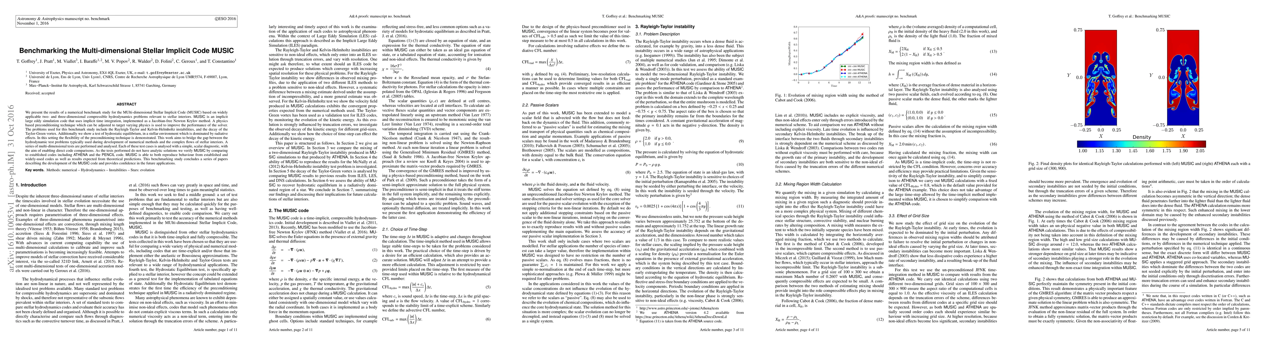 This paper benchmarks the MUSIC code for multi-dimensional stellar hydrodynamics, using tests like Rayleigh-Taylor and Kelvin-Helmholtz instabilities, and comparing results to established codes like ATHENA and PENCIL. The study demonstrates MUSIC's capability to handle complex stellar flows and validates its performance through various diagnostic analyses.